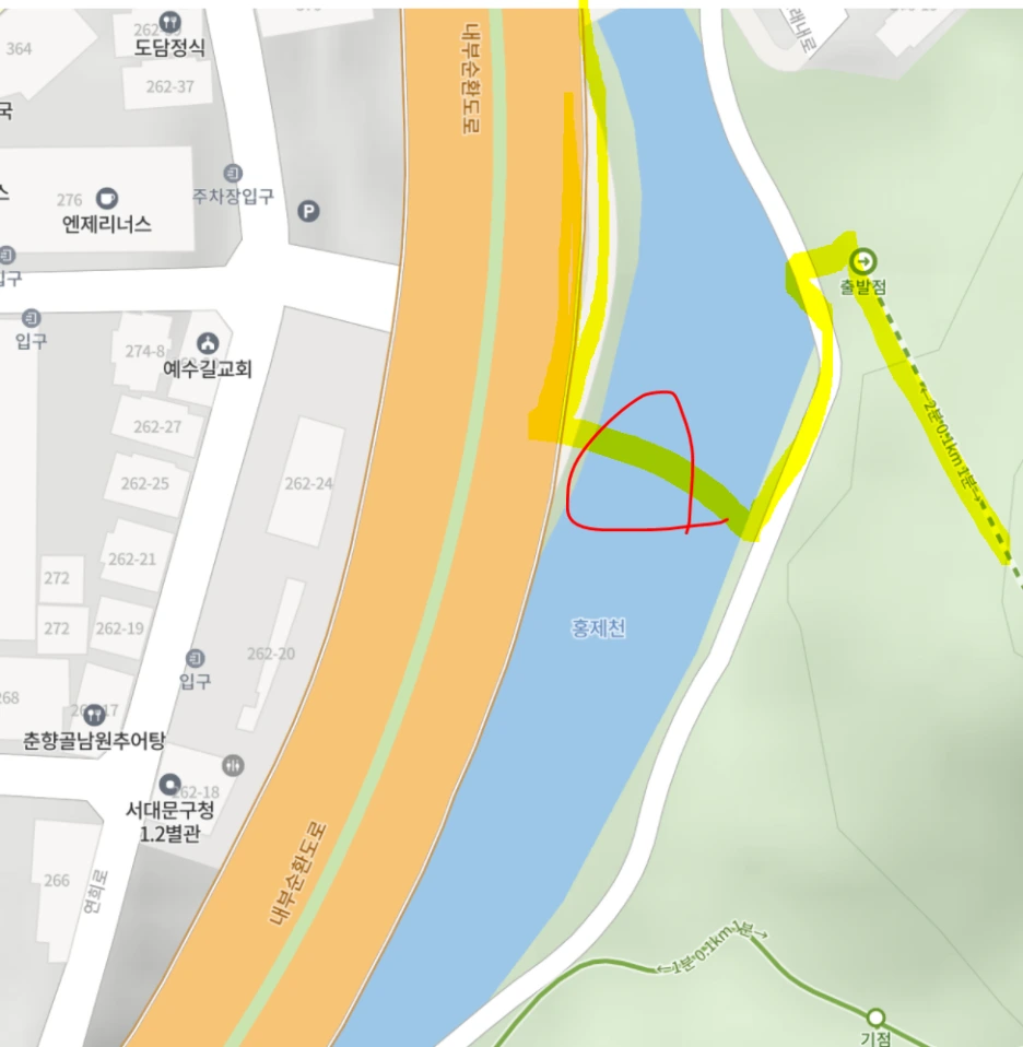 정확히 기억은 안 나지만, 저 빨간색 위치가 확실할 거다. 밤이 깊어지기 전에 홍제천 방향으로 빠져나가 본다.