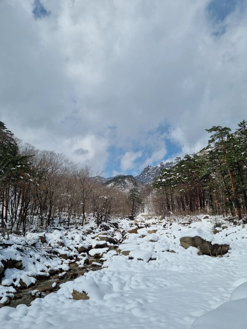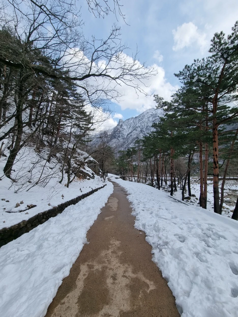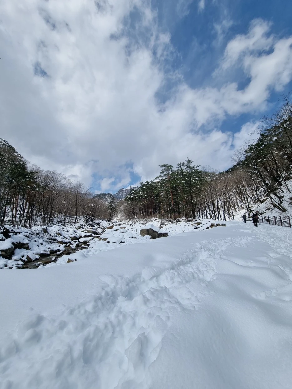 생각보다 눈이 깊게 쌓여있었다. 한 발짝 두 발짝 올라갈 때마다 운동복 복 빈틈 사이로 눈망울이 하나하나 흡수되기 시작했다. 무릎이 서서히 시리기 시작했지만 이내 포기하지 않았다. 언제 내가 또 이 설악산 자락이라도 와 볼 것인지 나도 잘 알고 있었지. 적어도 후회가 없다면 정말 잘한 일이 아닐까 한다.
