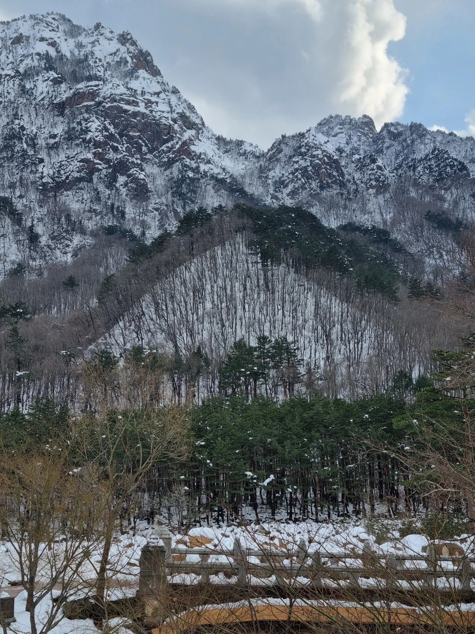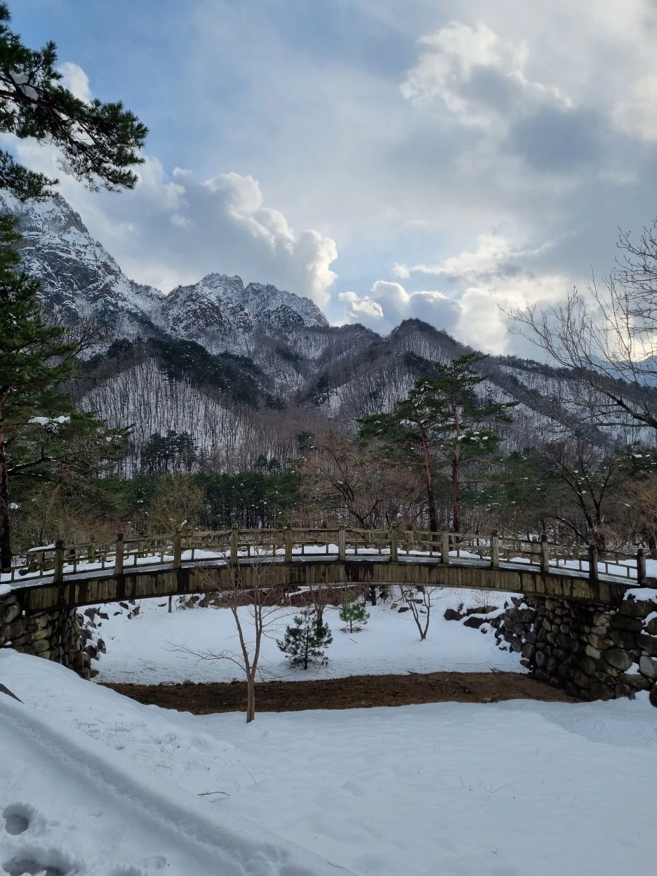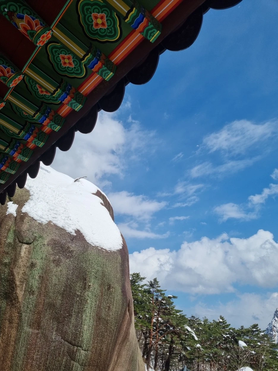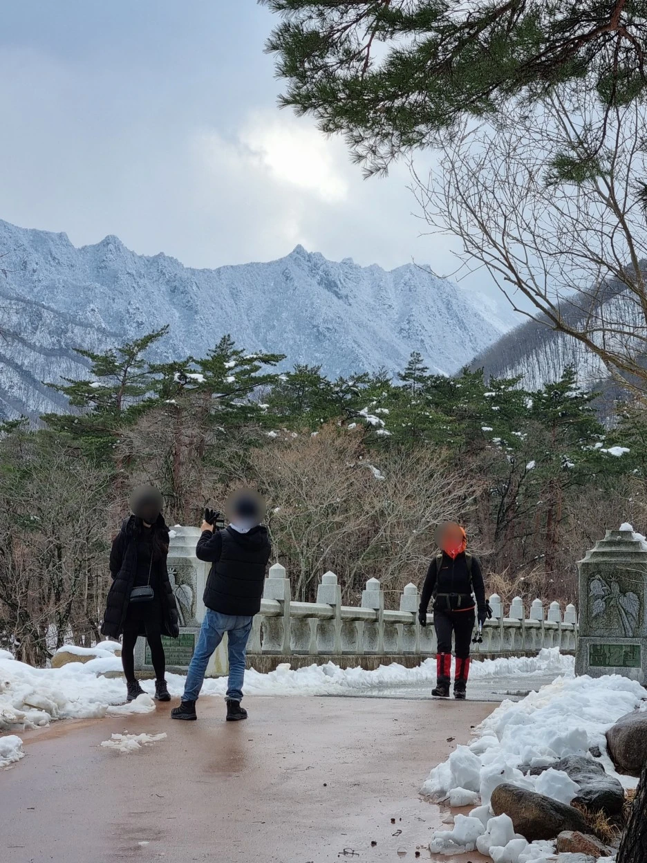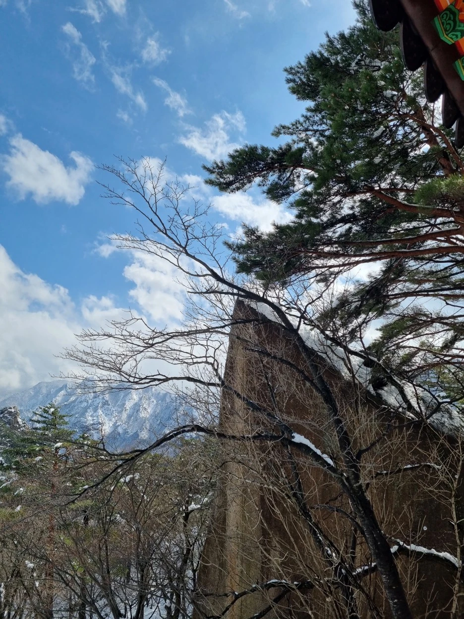 난 신발을 잠깐 마룻바닥 아래 큰 기단에 살포시 벗어놓고 마루 위에 앉아 눈 내린 설악산 자락 풍경을 구경하기 시작했다. 생각보다 고요했고 그저 어느 참나무 위에서 지저귀는 파랑새의 목소리가 저 멀리 들리기 시작했다. 외국인 친구들이 나에게 사진을 찍어주겠다며 칭찬 섞인 활기참을 드러내었다. 나도 그 기분에 덩달아 유튜브에 올릴 것이냐면서 장난 섞인 말을 했지만 그렇게 하겠다면서 자부했더라. 알고 보니 그 친구들 중 한 명은 유튜버 크리에이터였다. 나에게 구독해달라며 미소 머금은 표정을 짓더니 이내 울산바위로 향해 이동하던 그 친구들이 아직도 기억난다.