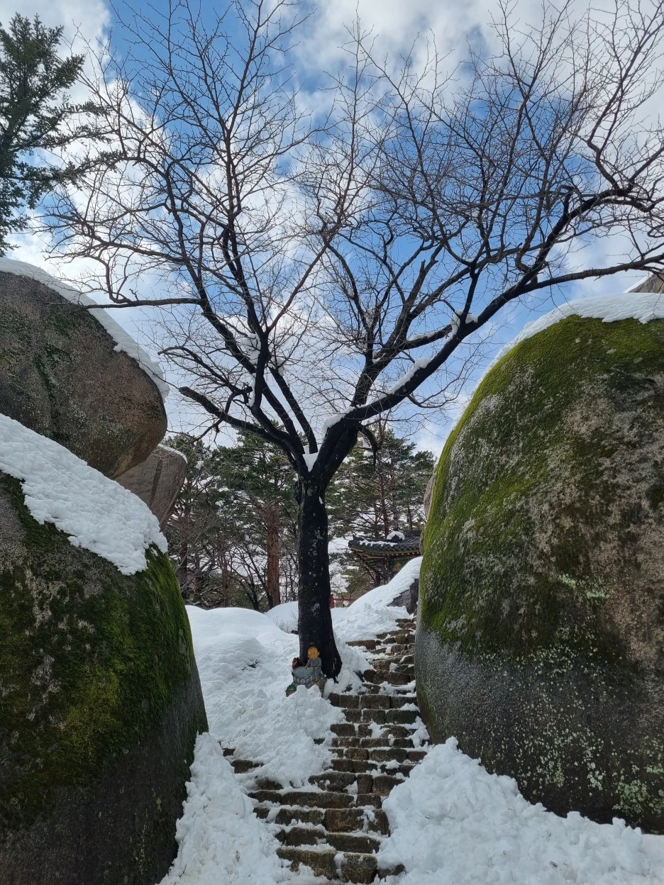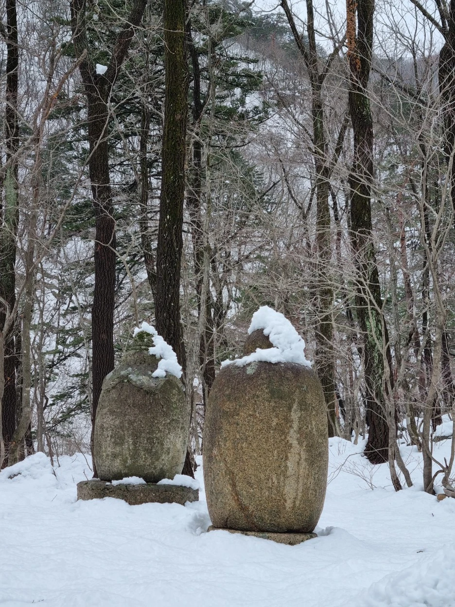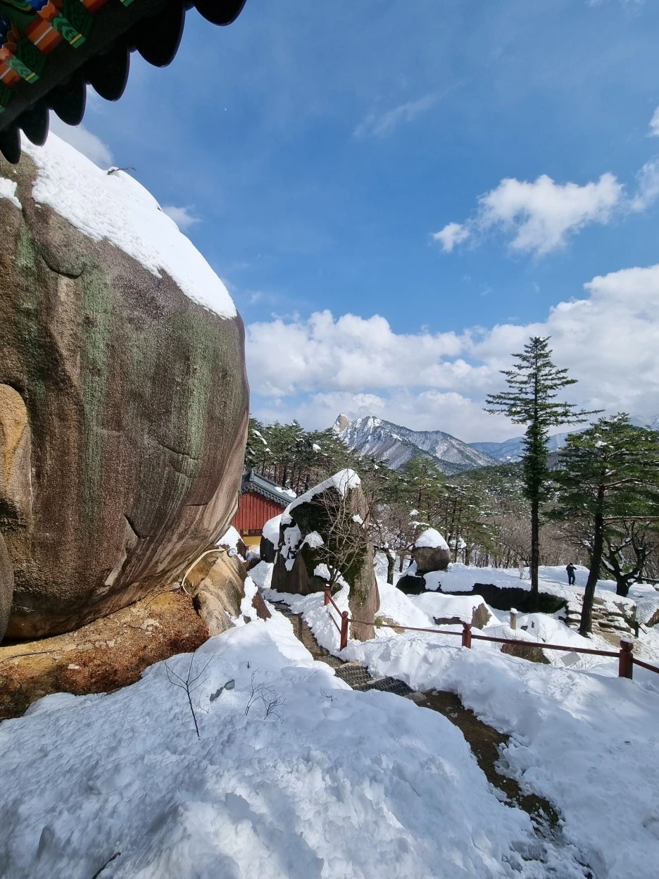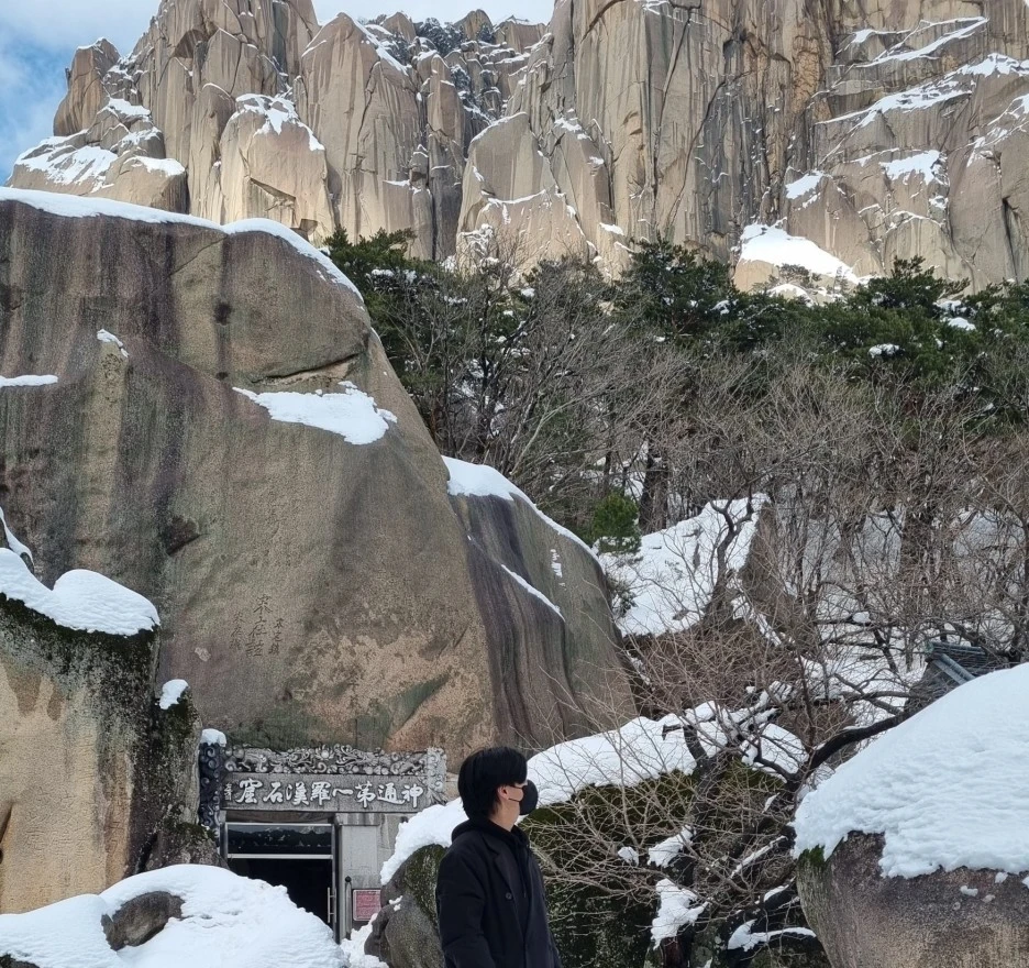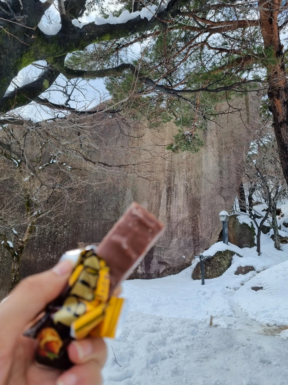 이윽고 내원암 스님께서 주신 초코바를 입에 물었다. 감미로운 초콜릿 열량이 나의 몸속으로 퍼지기 시작했다. 뜻깊었던 사색의 시간과 사유의 감정은 그때 비로소 발현되었다. 마스크를 잠깐 벗어던지고 관광객들이 없는 틈을 타서 소복이 눈이 쌓인 바위 침대 위에 누워보았다. 10분 정도 있었는데 등이 굉장히 시린 거 외에는 별도의 짜증남이 없었다. 자연과 한 몸이 되었다는 생각이 머릿속을 맴돌았고 난 5분 정도 더 누워버렸다.