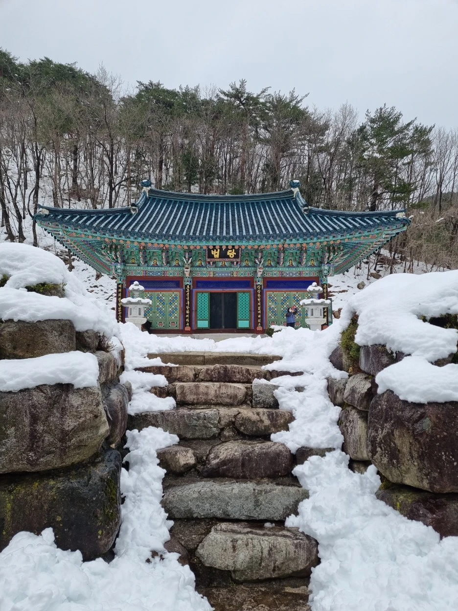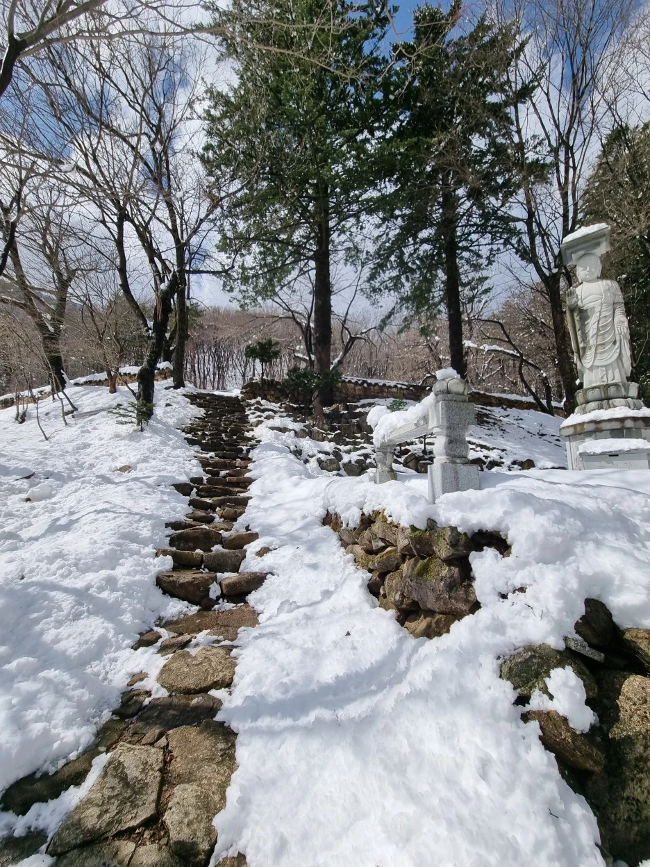 말 한마디에 예쁨과 정성, 그리고 겸손이 함께 묻어나 보였다. 왜 사람이 겸손해야 하는지 나는 그분이 나에게 알려주지 않았지만 지극정성으로 나를 되돌아보고 살펴야 한다는 의미로 해석했다. 하물며 그 스님은 싸라기를 들고 내원암 근처에 있는 눈을 쓱쓱 쓸어가기 시작했다. 저 멀리 파랑새가 스님에게 속삭이는 듯한 느낌과 함께 나는 이내 그 자리를 계속 머무를 수밖에 없었다. 그저 더 감미로운 이 풍경을 사진 한 폭에 담고 싶었기 때문이었다.