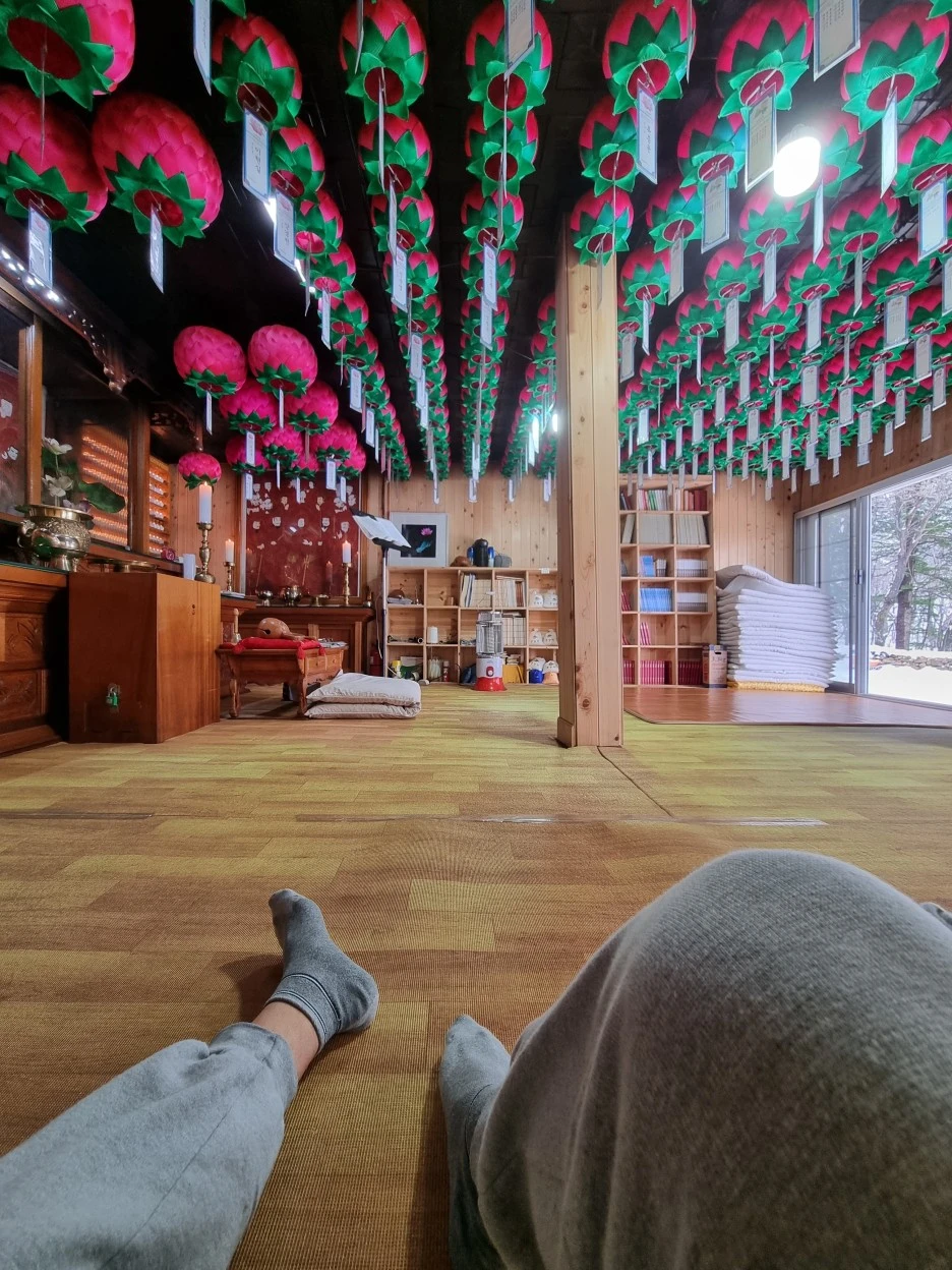 그래도 그 당시 생존을 위해서 어쩔 수 없는 선택이라고 생각된다. 그렇게 나는 이 책을 읽으며 또다시 마룻바닥에 걸터앉아 밖을 내다보았다. 20분이 지났을까. 옆방에 있던 어느 스님과 인사를 하게 되었고 나는 절실한 불교 신자가 아니었지만 그분께 절실한 90도 절을 하고는 이내 앞에 있는 석가모니상에도 큰 절을 올리기 시작했다. 어색함이 감도는 이 분위기 속에서 나에게 따스한 잣나무 이파리로 만든 차를 선뜻 내밀어 주셨다.