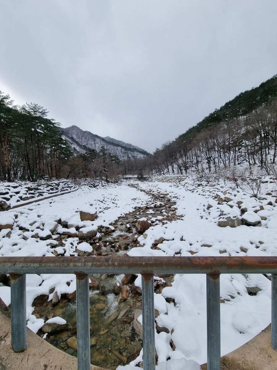 다시 이 길을 천천히 내려온다. 인적이 없는 곳이라 더 감미로웠다. 어느새 눈이 녹아내려 하천으로 흘러들어간다.