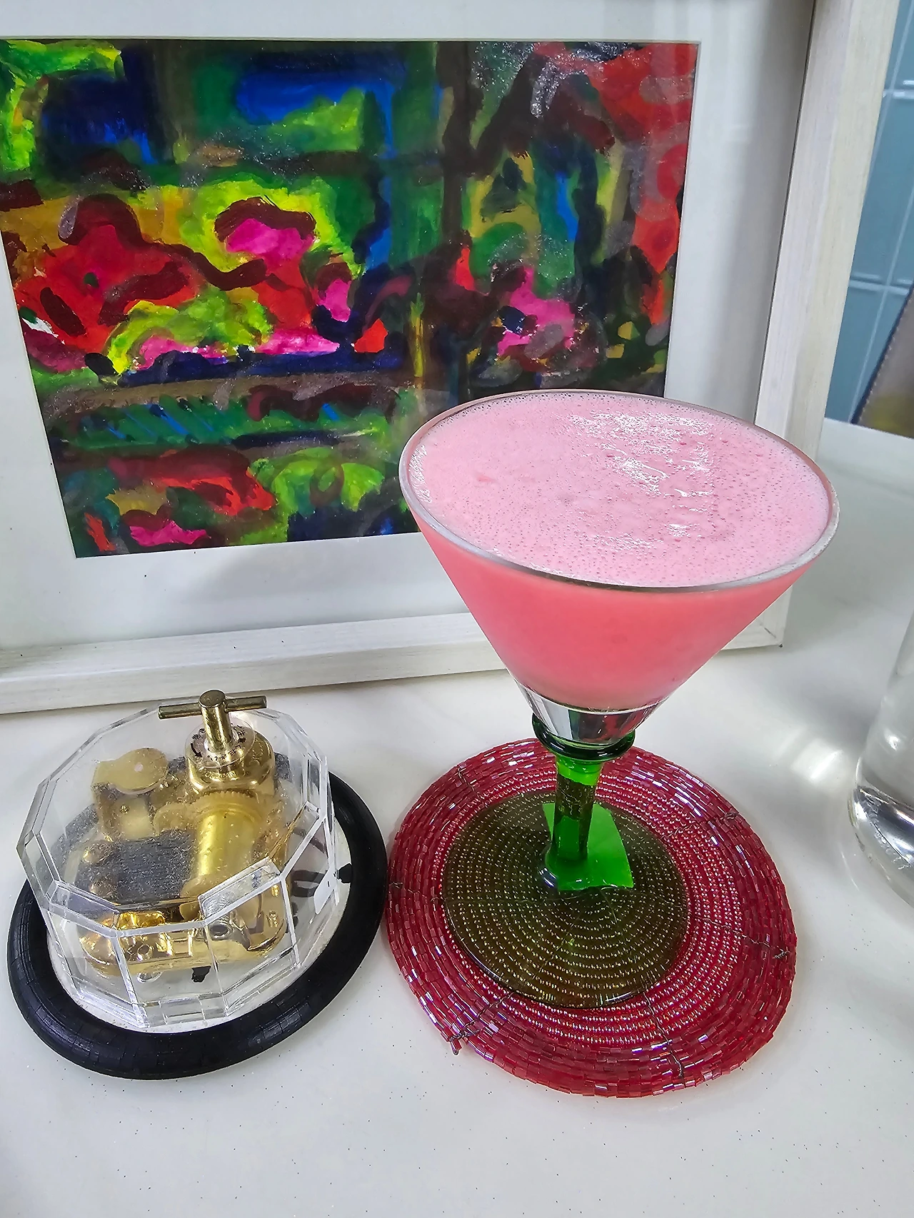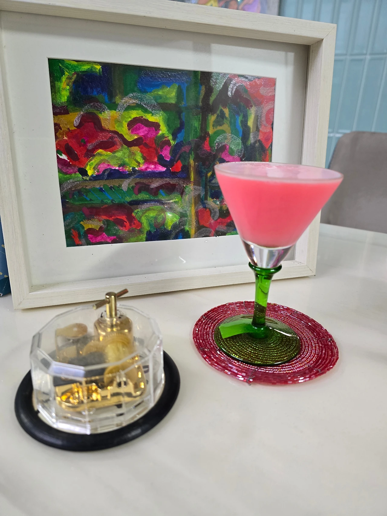 오르곤의 선울과 내그림 마젠타 컬러가 들어가있는 "어느날"이라는 그림앞에 내가 주조한 핑크레이디를 세워놓으니 참 좋다.