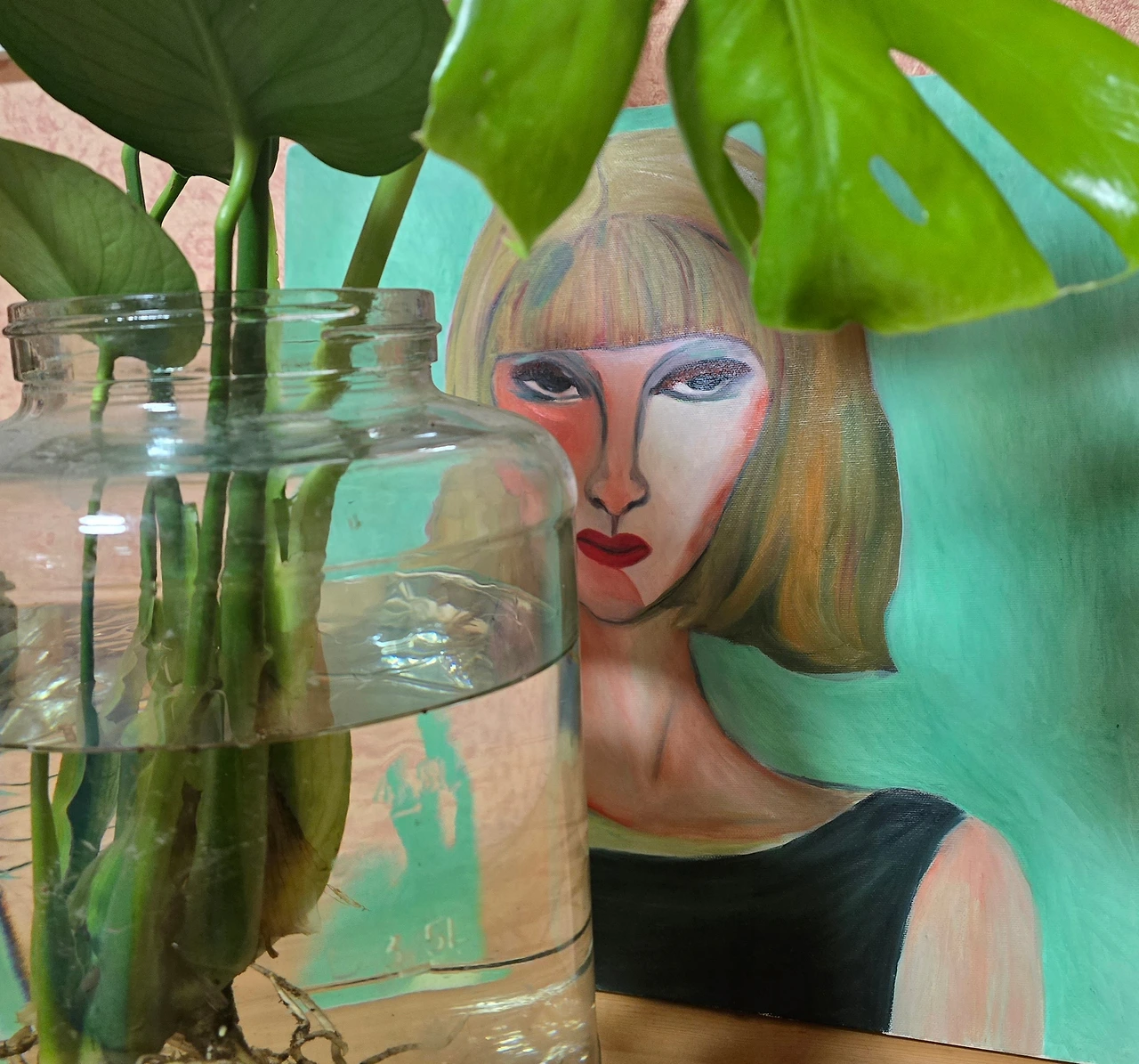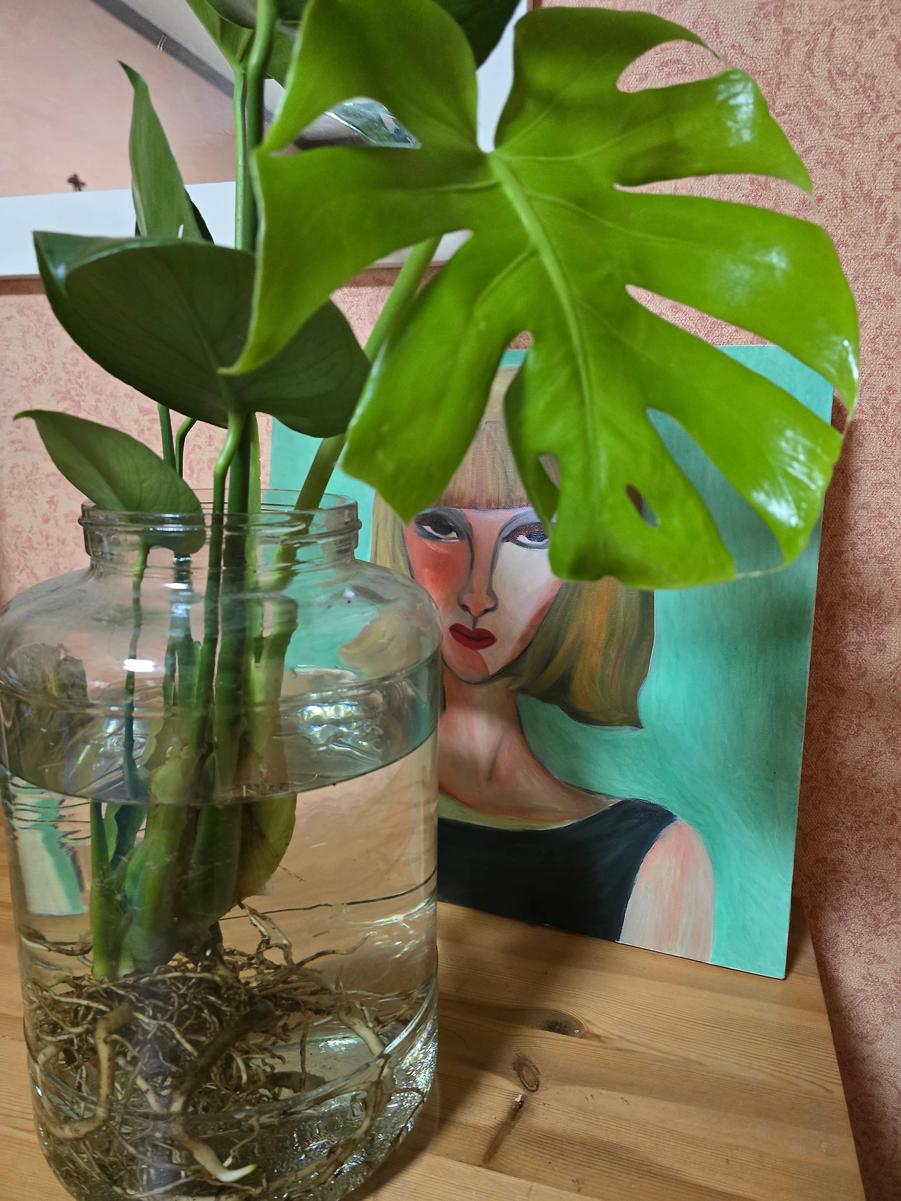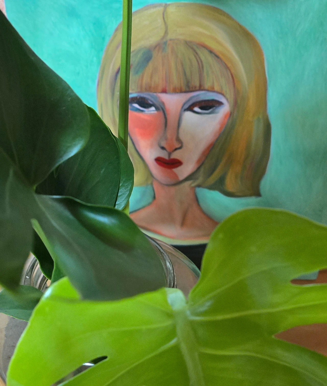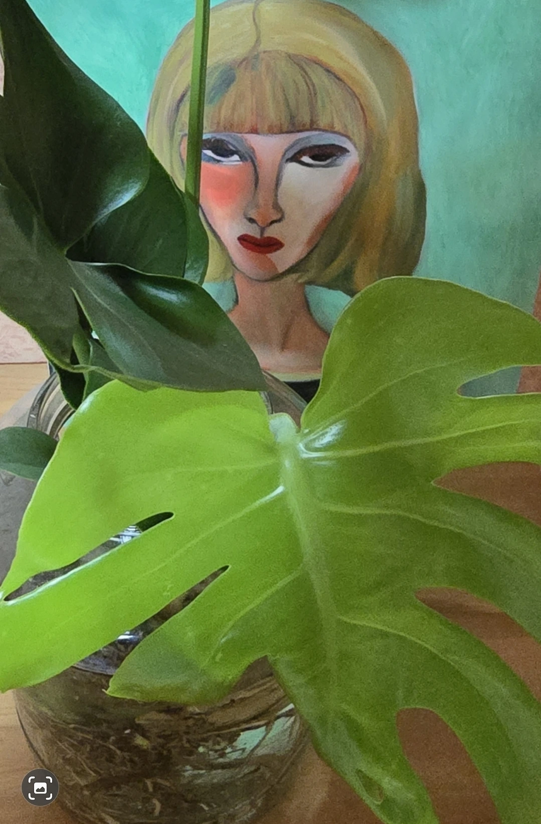 냉철한 여인을 배경으로 앞에 서있는 성장하는 나의 몬스테라는