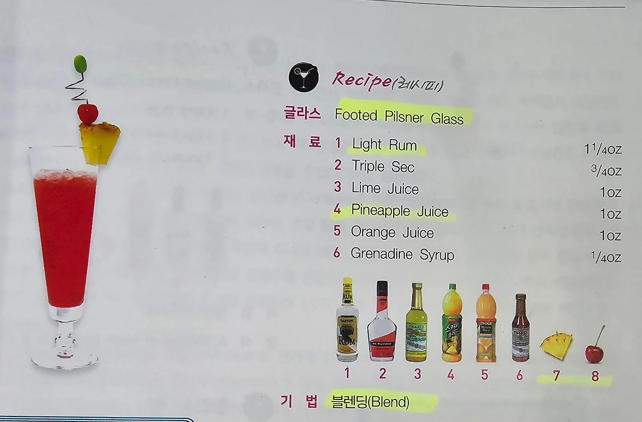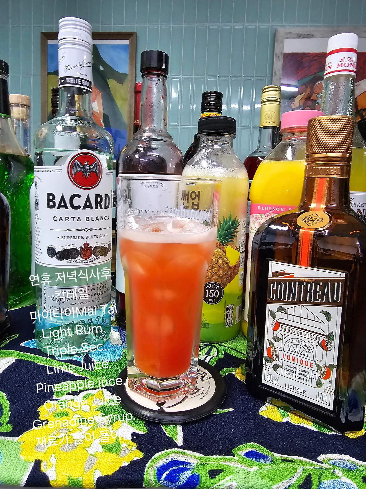 ※마이타이(Mai- Tai)는 타이티어로'최고'라는 의미이다. 1944년 미국 오클랜드에 있는 폴리네시안 레스토랑인 '토레다 빅스'의 오너인 빅터J.바자로가 창안한 칵테일이다.