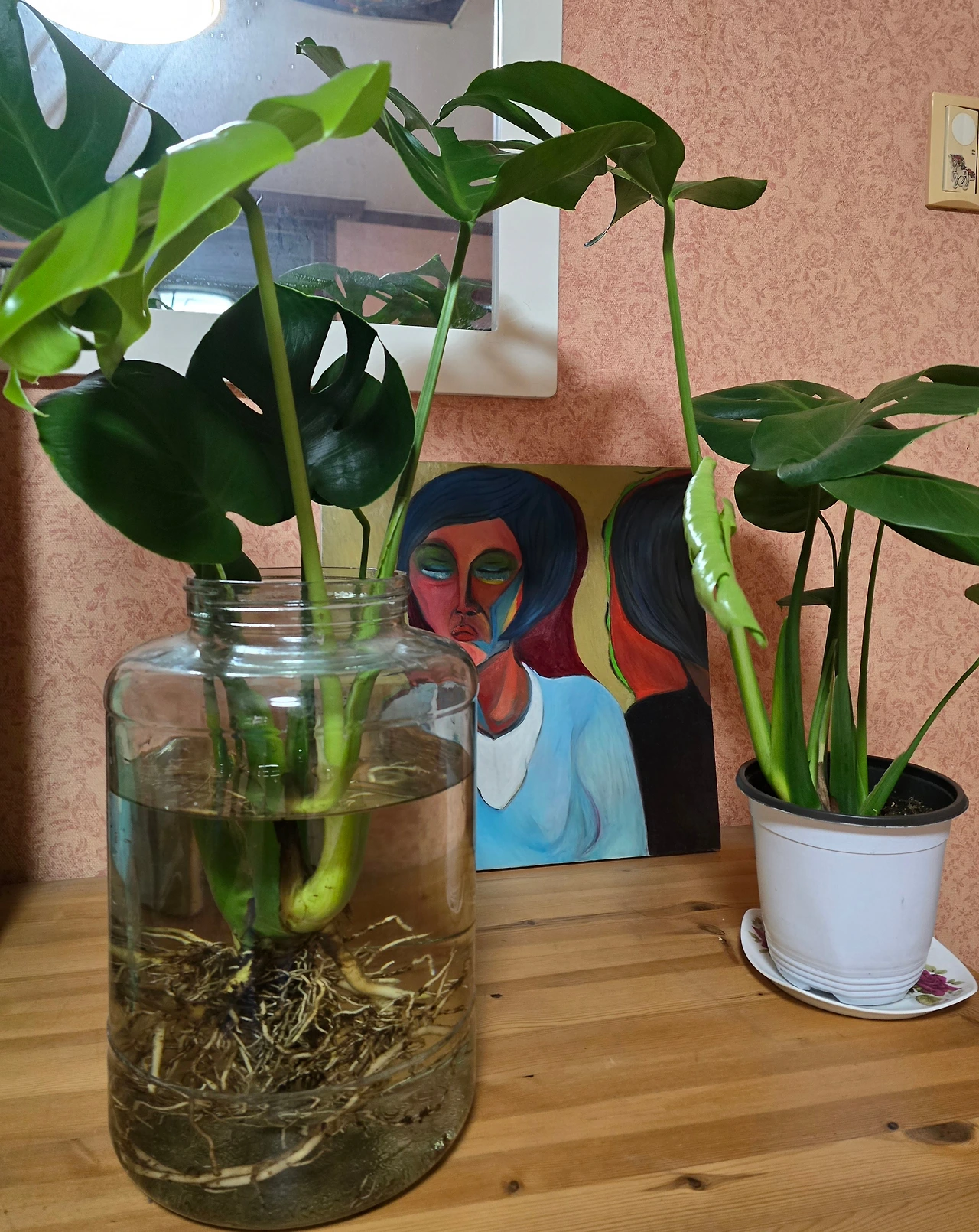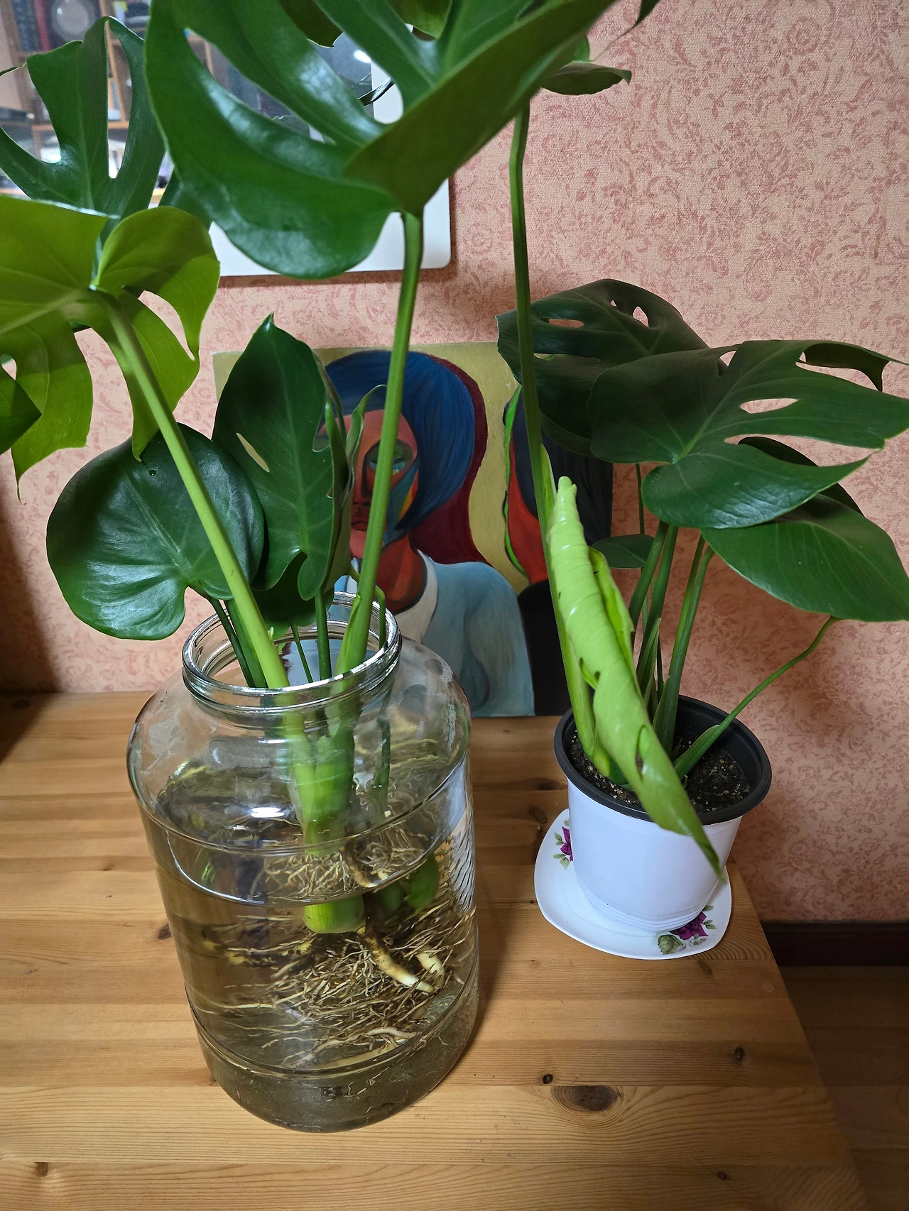 처음에 집에 오자마자 흙을 다 털어내고 물속에 풍덩 담그어놓은 그 몬스테라의 잘자람에 고마워 친구를 옆에 데려다 놓아주었다.
