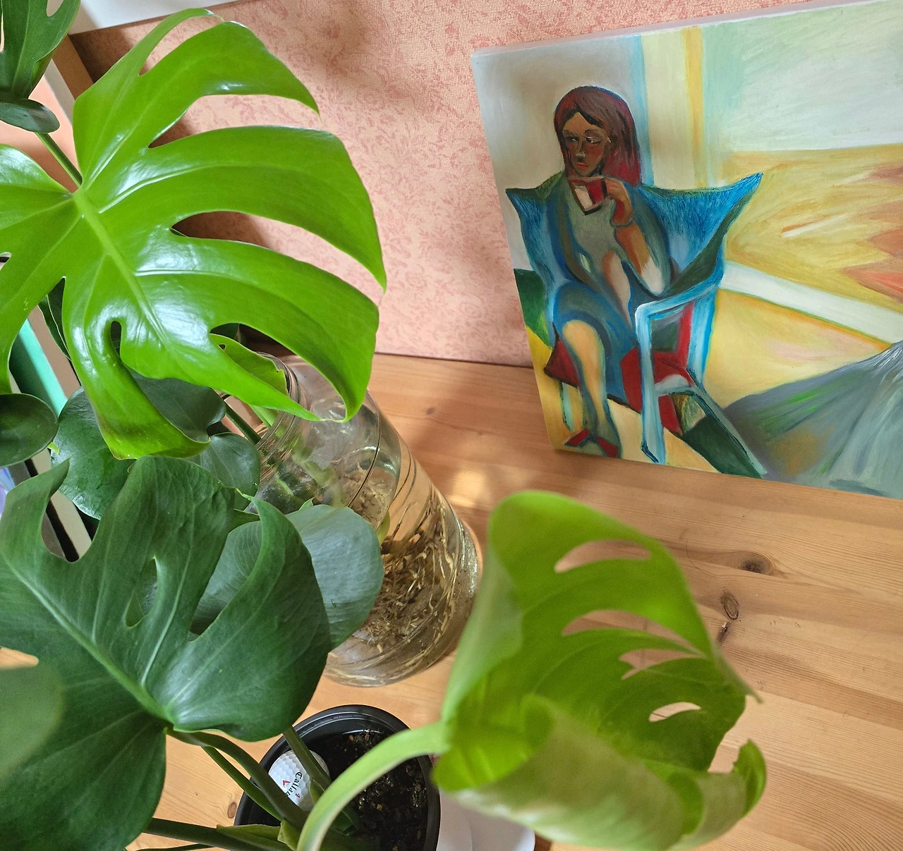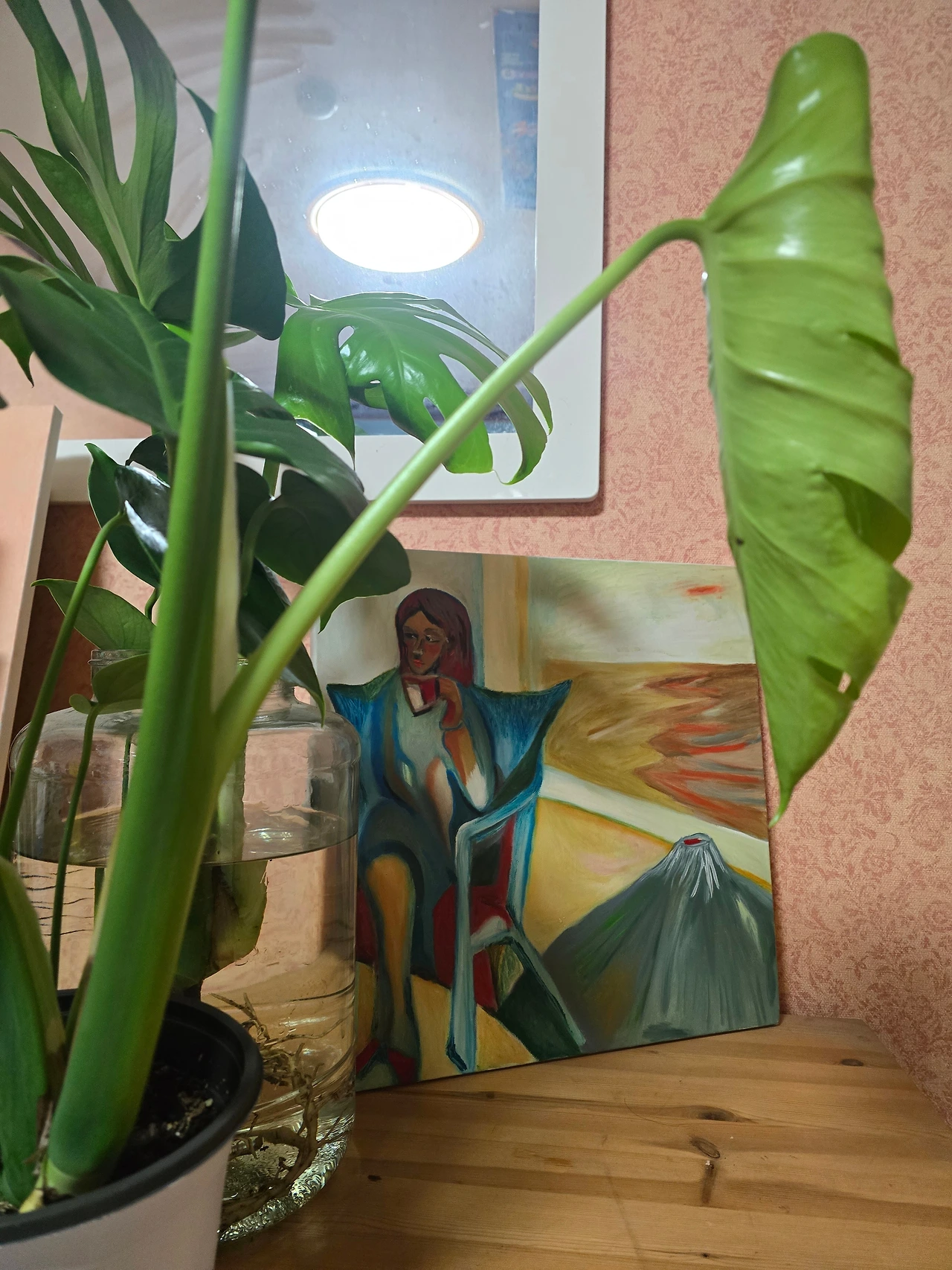 2022년에 전시 "분노는 창조의 에너지"에서 그렸던 잠시 에너지충전을 위해 분노라는 화산앞에서 에너지를 받고 있는 여인을 배경으로 놓았다.