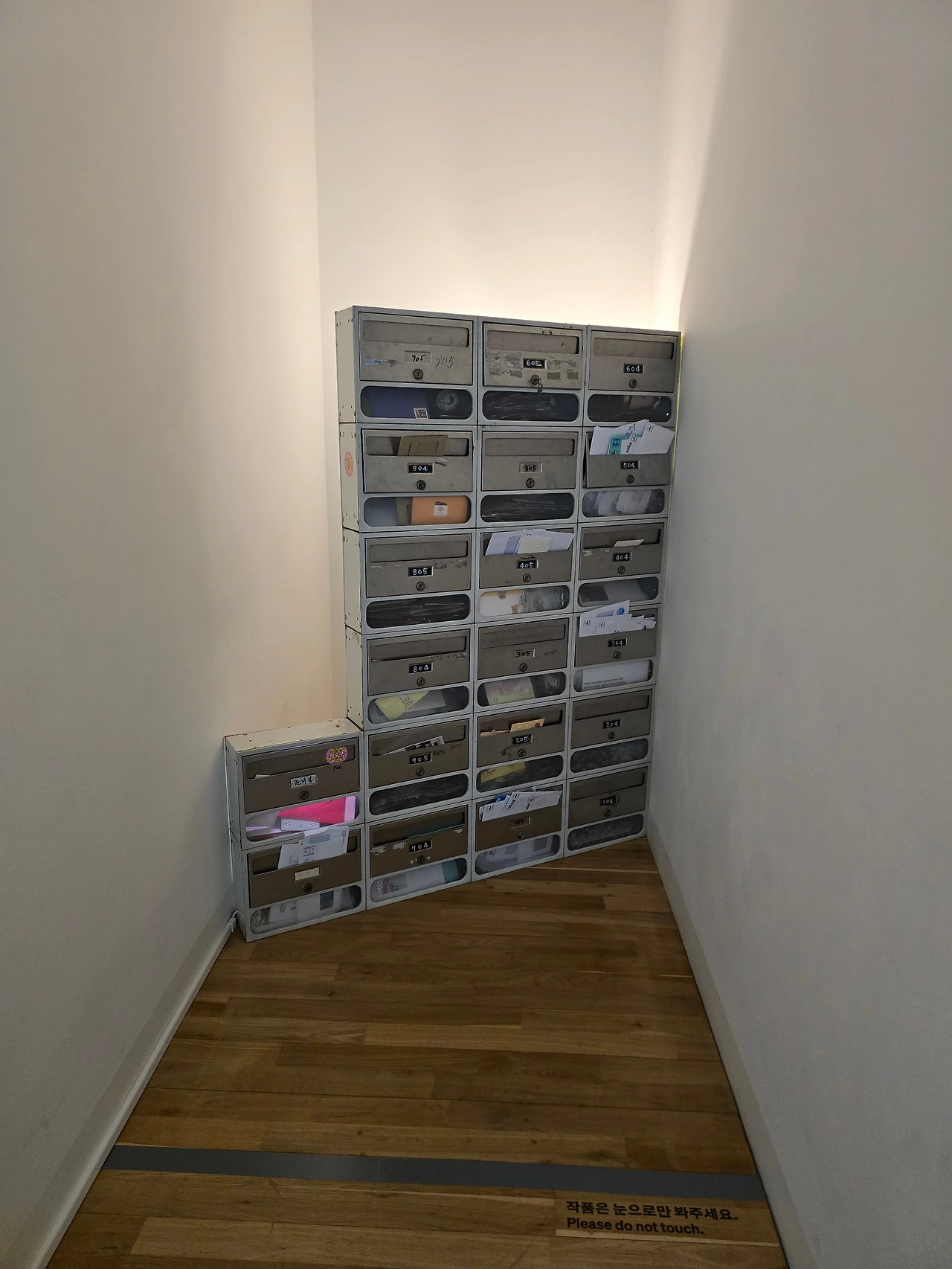 작가의 우편함 설치작품 앞에서 작가의 멘트를 숨죽이며 듣고 있었다.