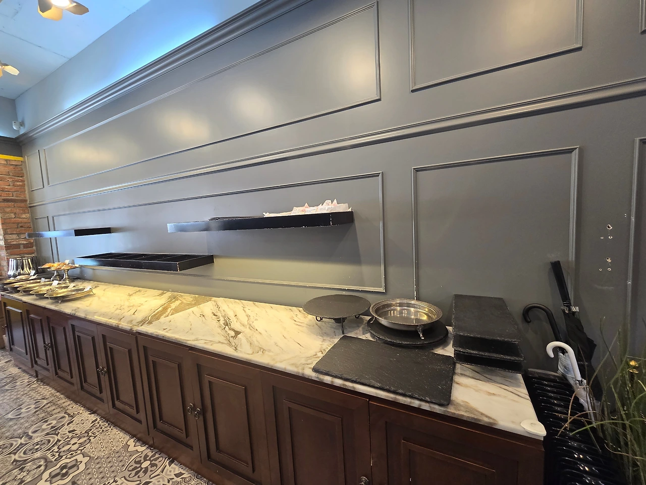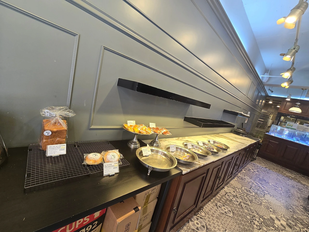 한쪽벽면에 줄지어 진열된 빵