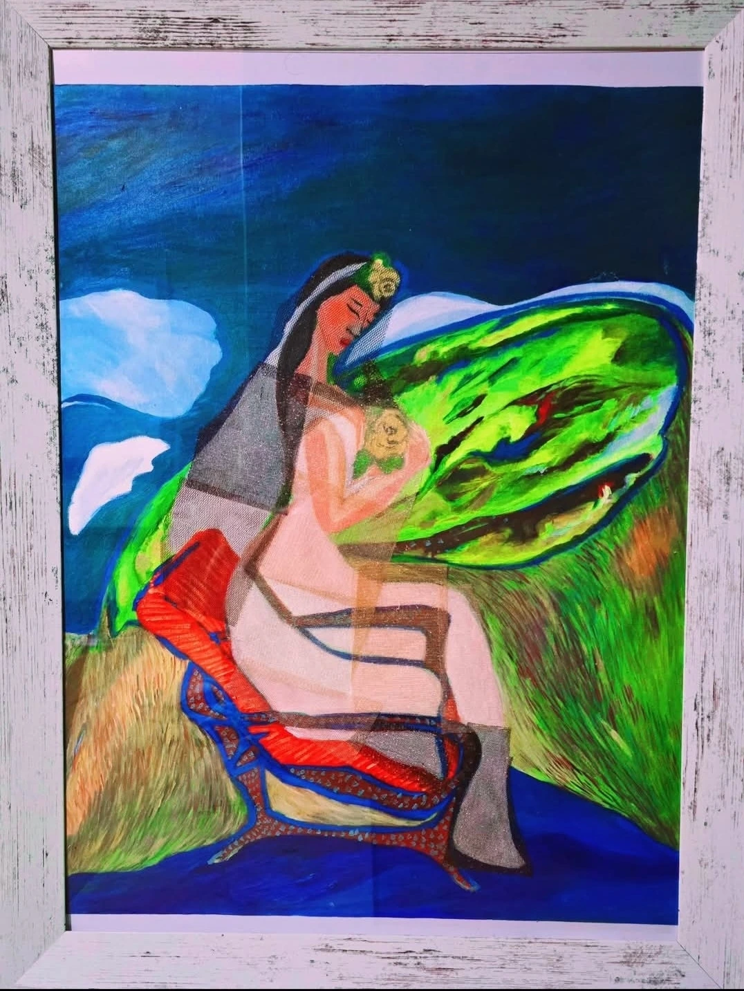 제주 오름의 꼭대기에 앉아 황금꽃을 머리에 꽂고 황금꽃을 가슴에 품으며 신성한 제주의 정취를 체감하며 앉아있는 그녀.