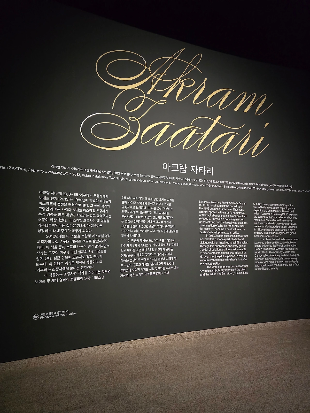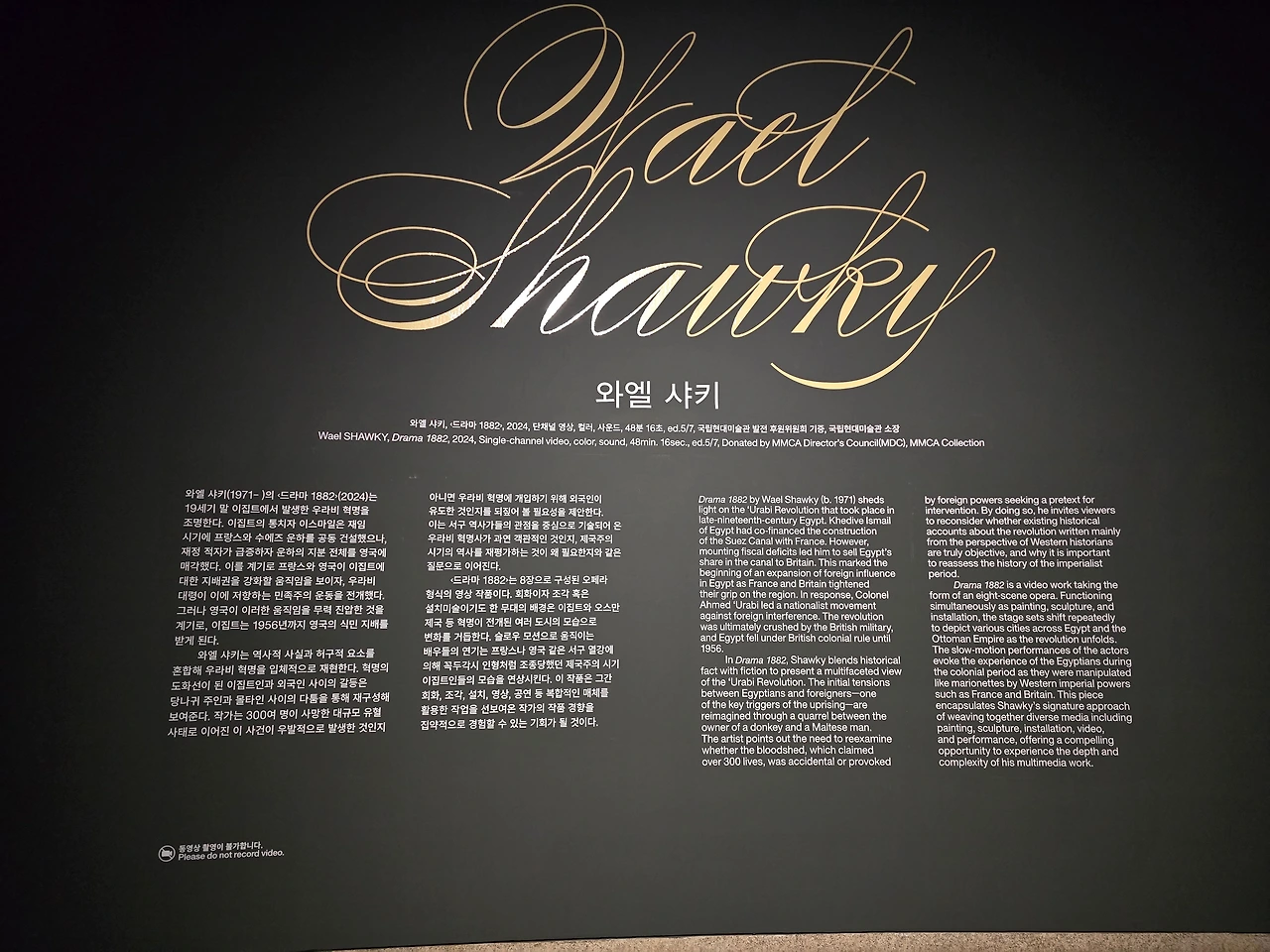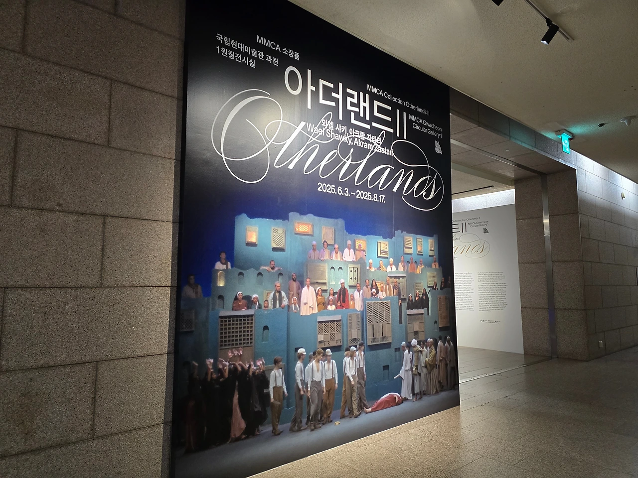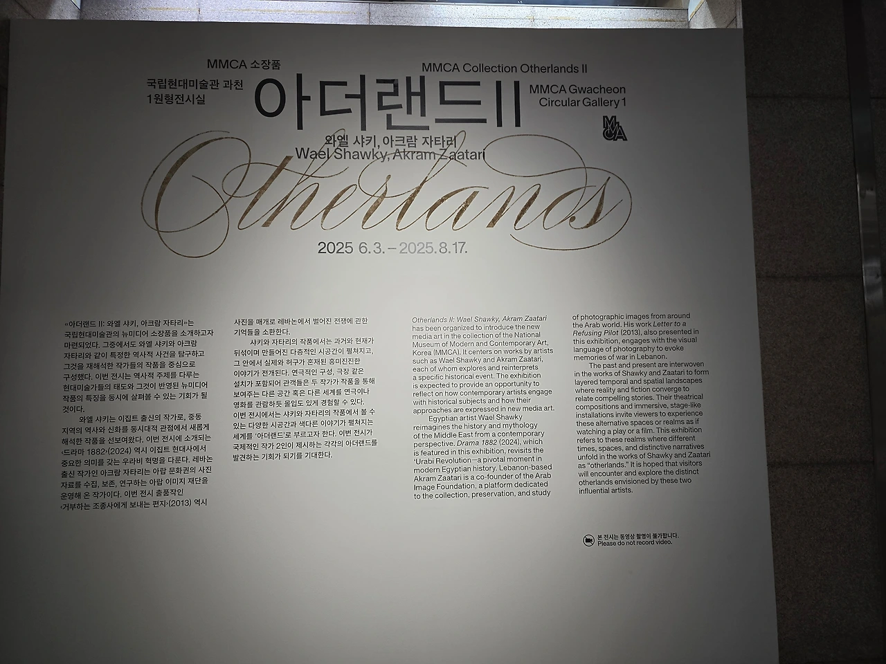 - 아더랜드Ii: 와엘 샤키, 아크람 자타리는 국립미술관의 뉴 미디어 소장품을 소개하고자 마련되었다.그중에서도. 와엘 샤키와. 아크람 자타리와같이 특정한 역사적 사건을 탐구하고 그것을 재해석한 작가들의 작품을 중심으로 구성했다. 이번전시는 역사적 주제를 다루는 현대미술긴들의 태도와. 그것이 반영된 뉴미디어작품의 특징을 동시에 살펴볼 수 있는 기회가 될것이다.