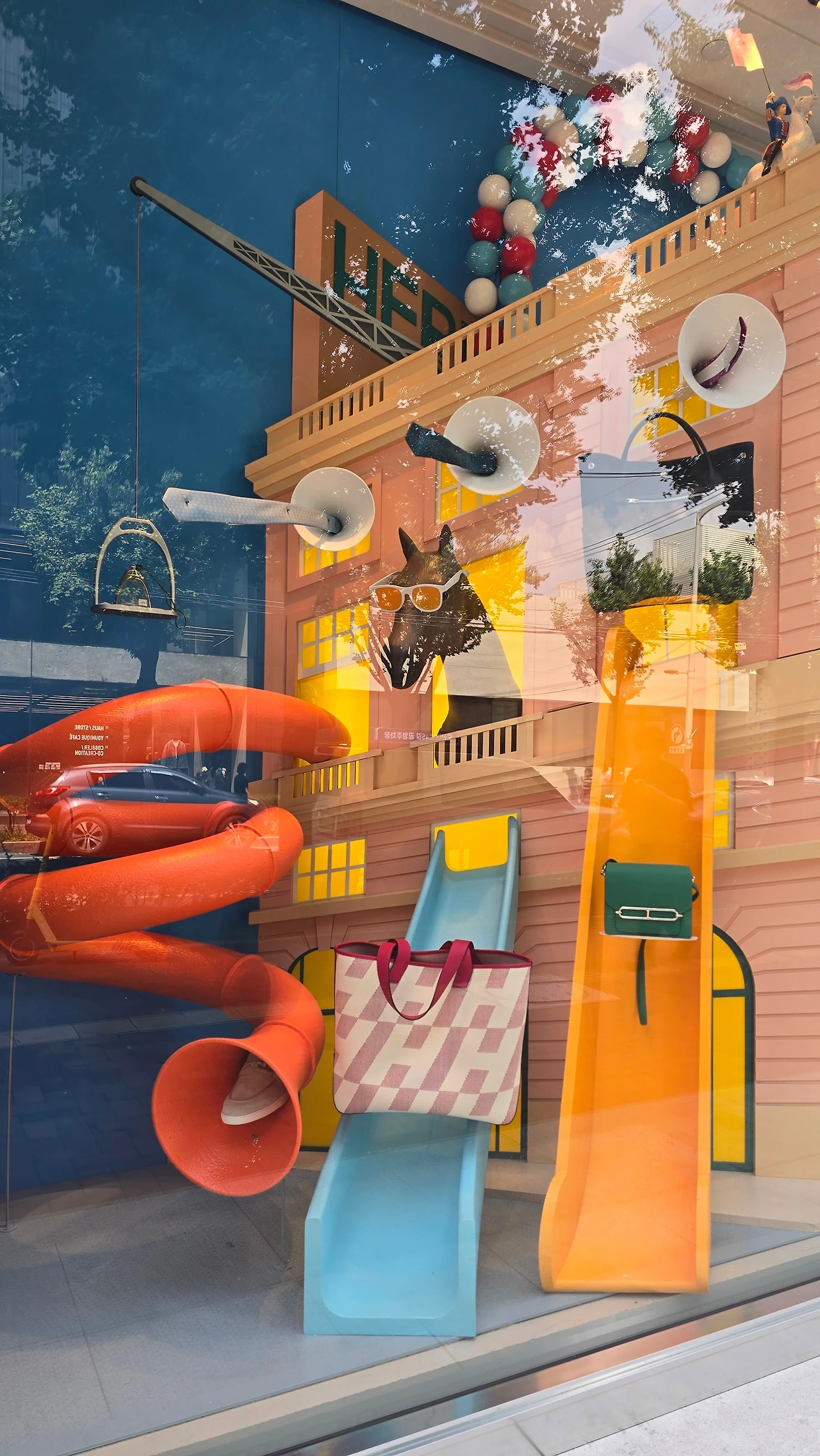 빙글빙글돌다가 에르메스 매장앞에서 알록달록한 컬러와 어린이놀이터 설치에 얹혀자 소위 명품이라는 가방이 놓여져 있는 디피된 공간을 보고 순간 가고자했던 행선지를 까맣게 잊고 매장앞에 서성이며 이리저리 바라보았다.