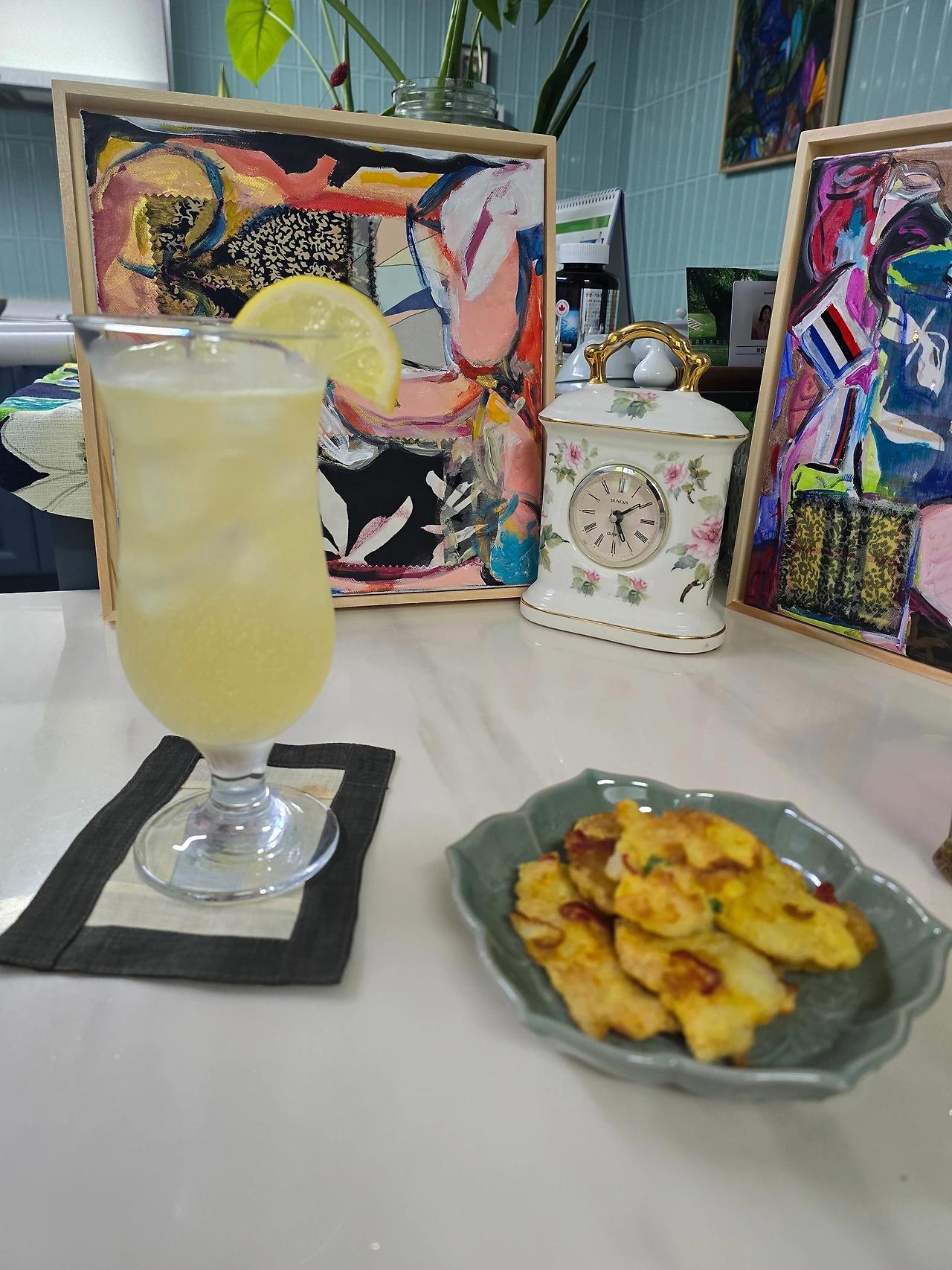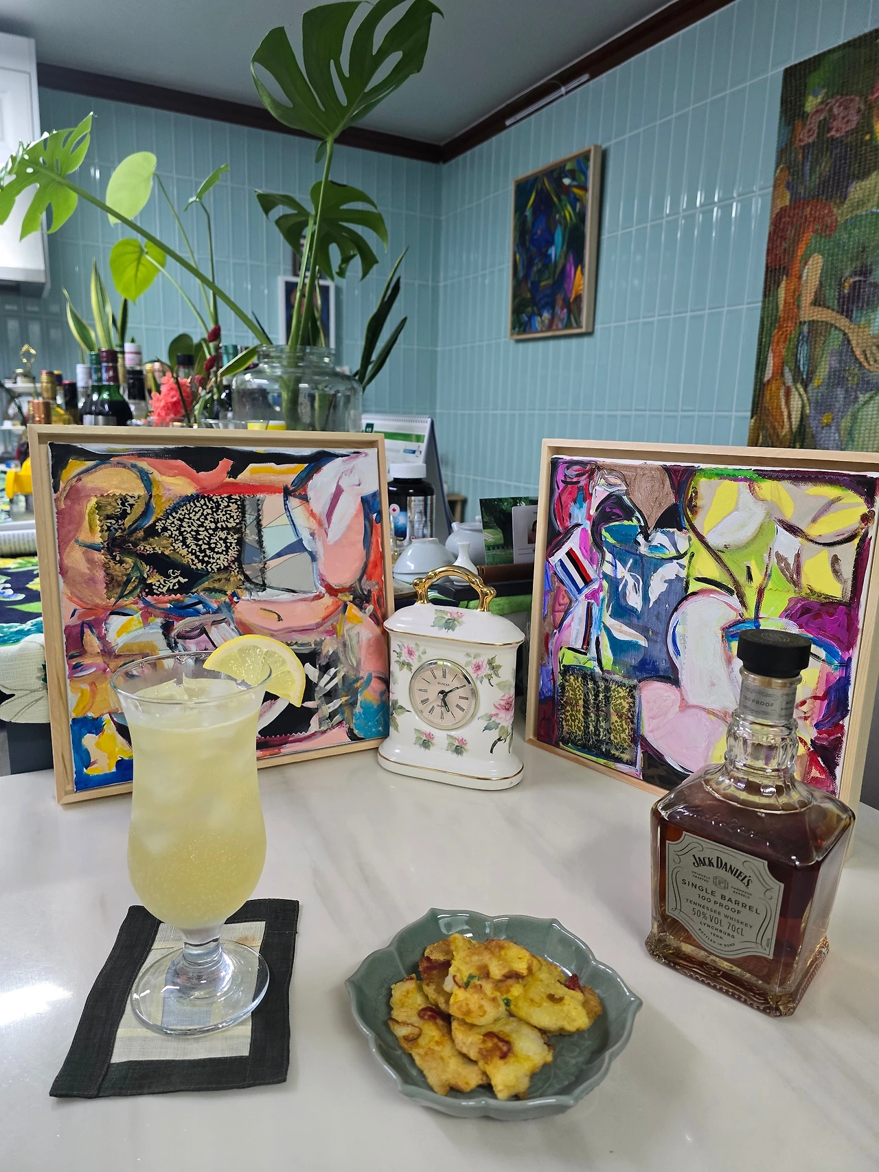 상큼한 레몬을 즙을 내어 많이 넣었더니 시큼하지만 위스키의 쓴맛을 가려주어 목에 샤워하듯 시원스럽게 넘어갔다.
