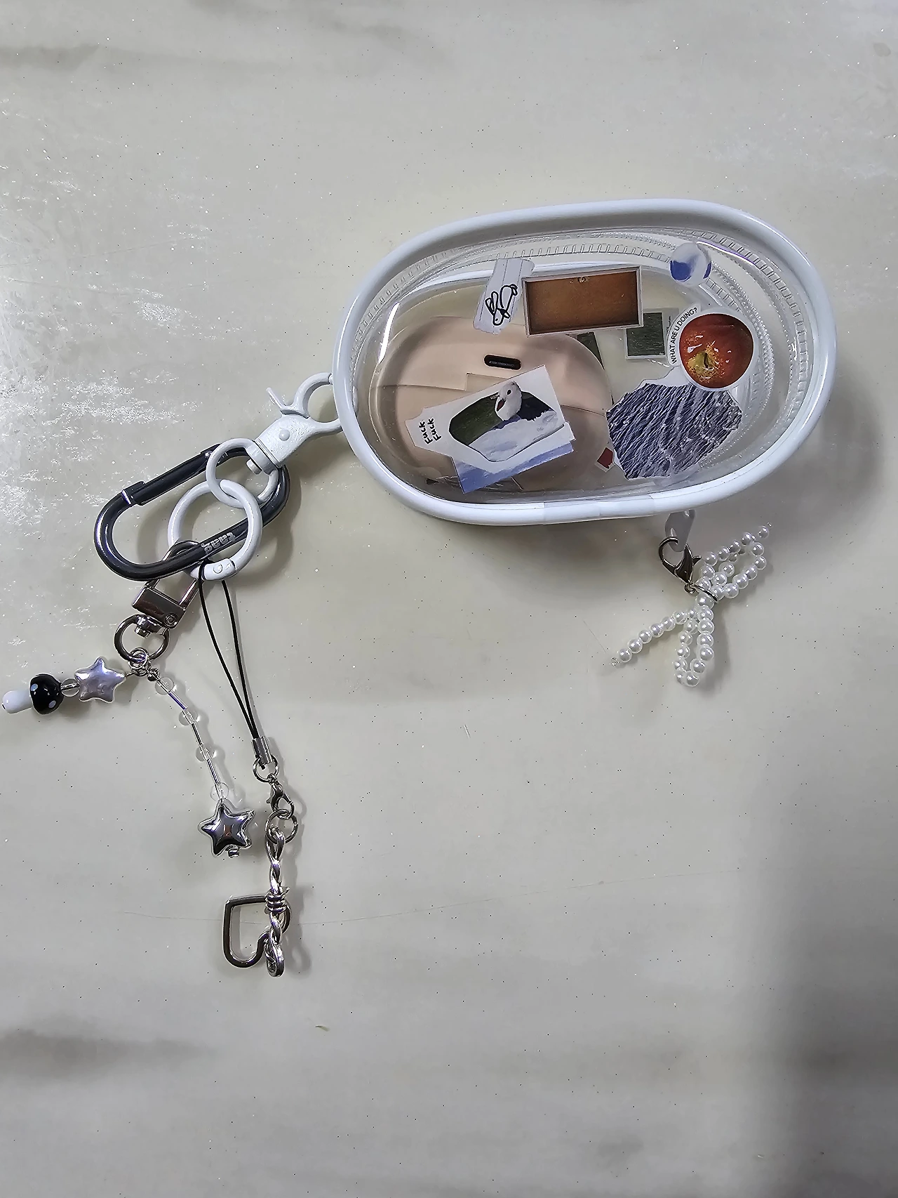 투명한 매우 작은 파우치에 스티커가 군데군데 붙어있었고