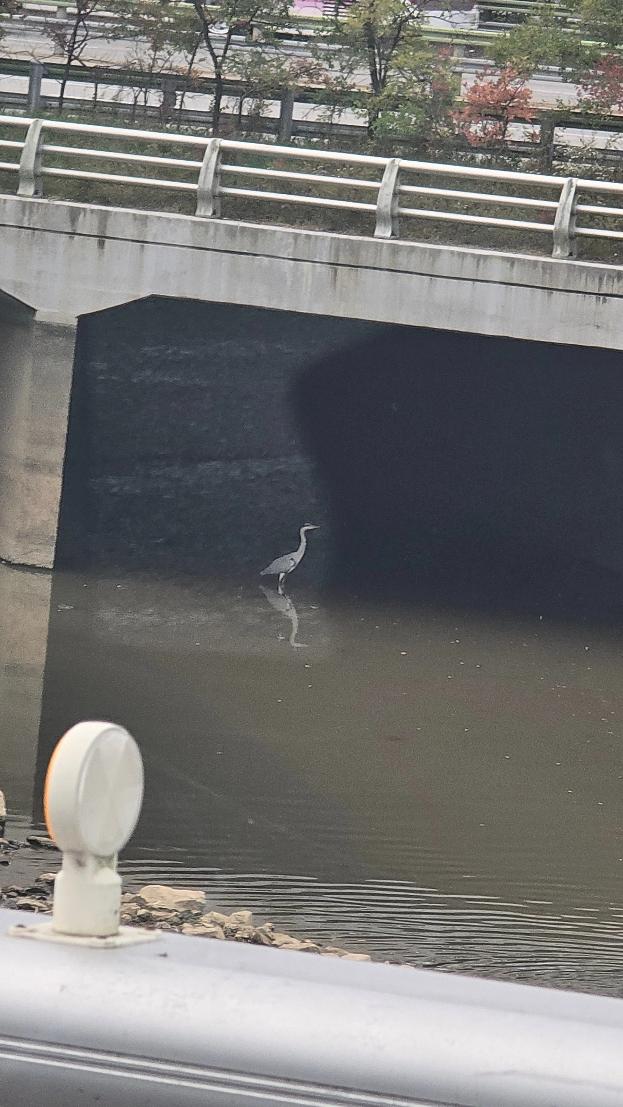 서울지역 작은 하천. 비오는날 아침에 버스를 타고 가는길에 차창너머 어린 두루미를 봤다.