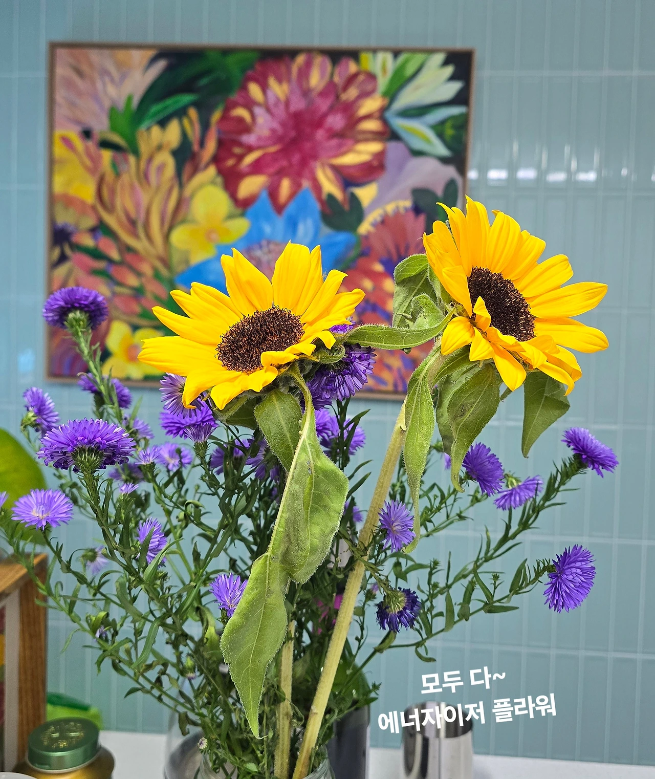 노랑과보라의 보색관계에 있는 꽂혀진 꽃과 뒷배경의 그림 에너자이저플라워가 묘하게 어우러져 있다.