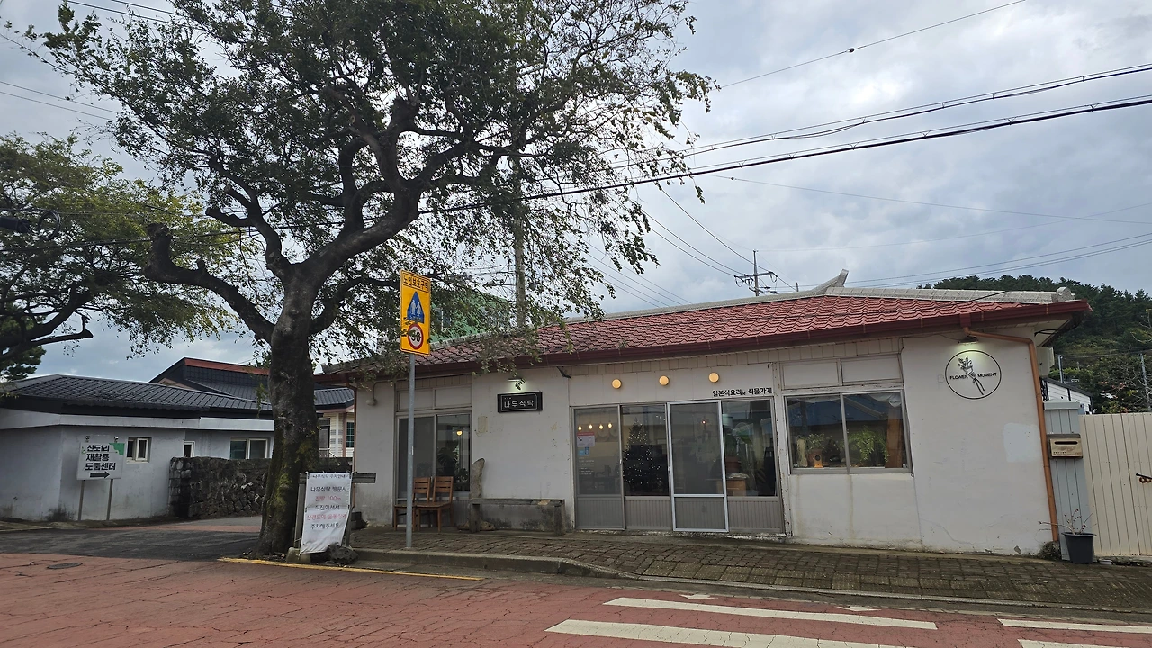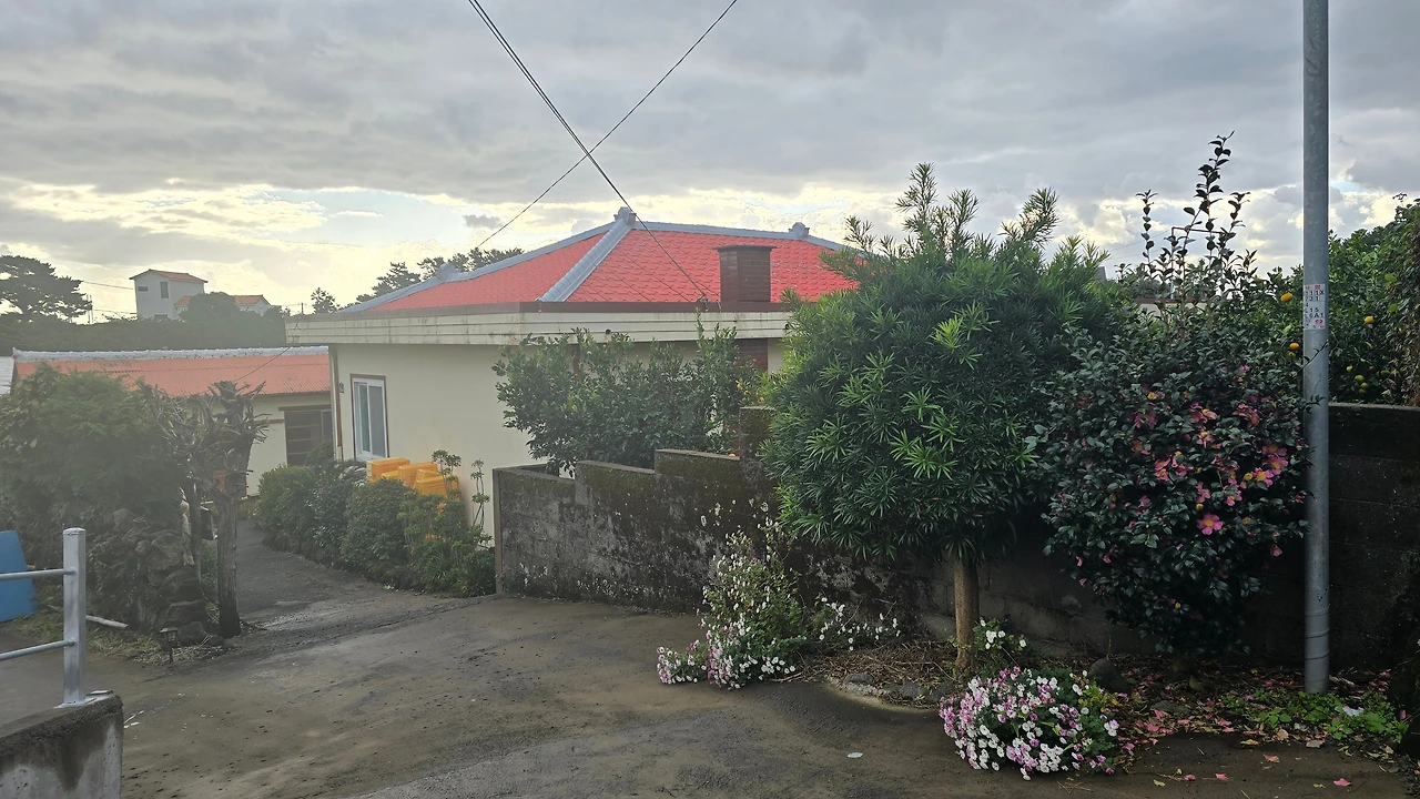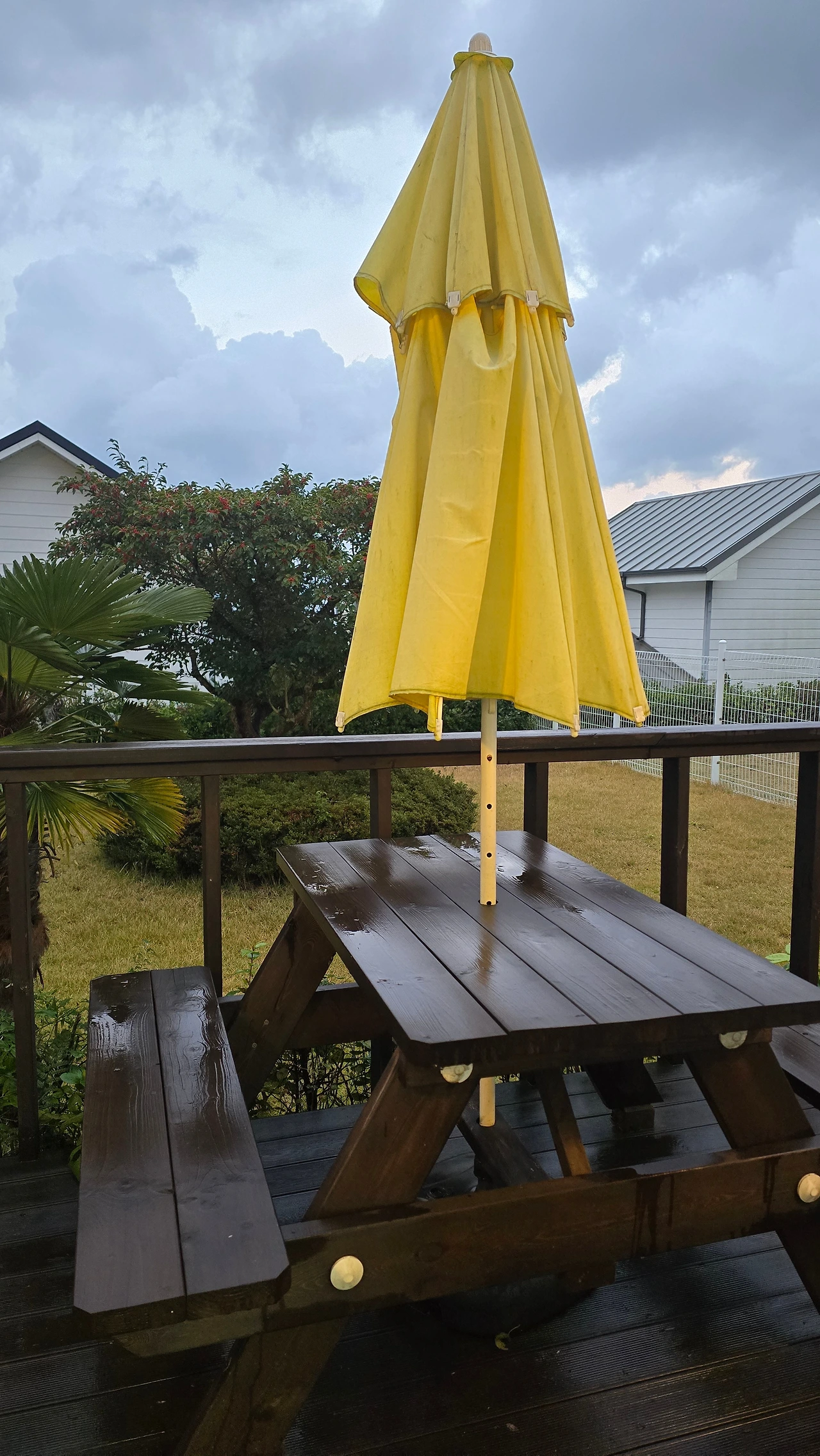 테라스에 있는 노랑색 접혀진 그늘막우산과 흐린날씨의 잿빛 하늘이 묘하게 어울리는 제주의 첫숙박 아침을 맞았었다. 상큼한 비온날의 대지 내음을 맡으며 하루의 문을 열었다.