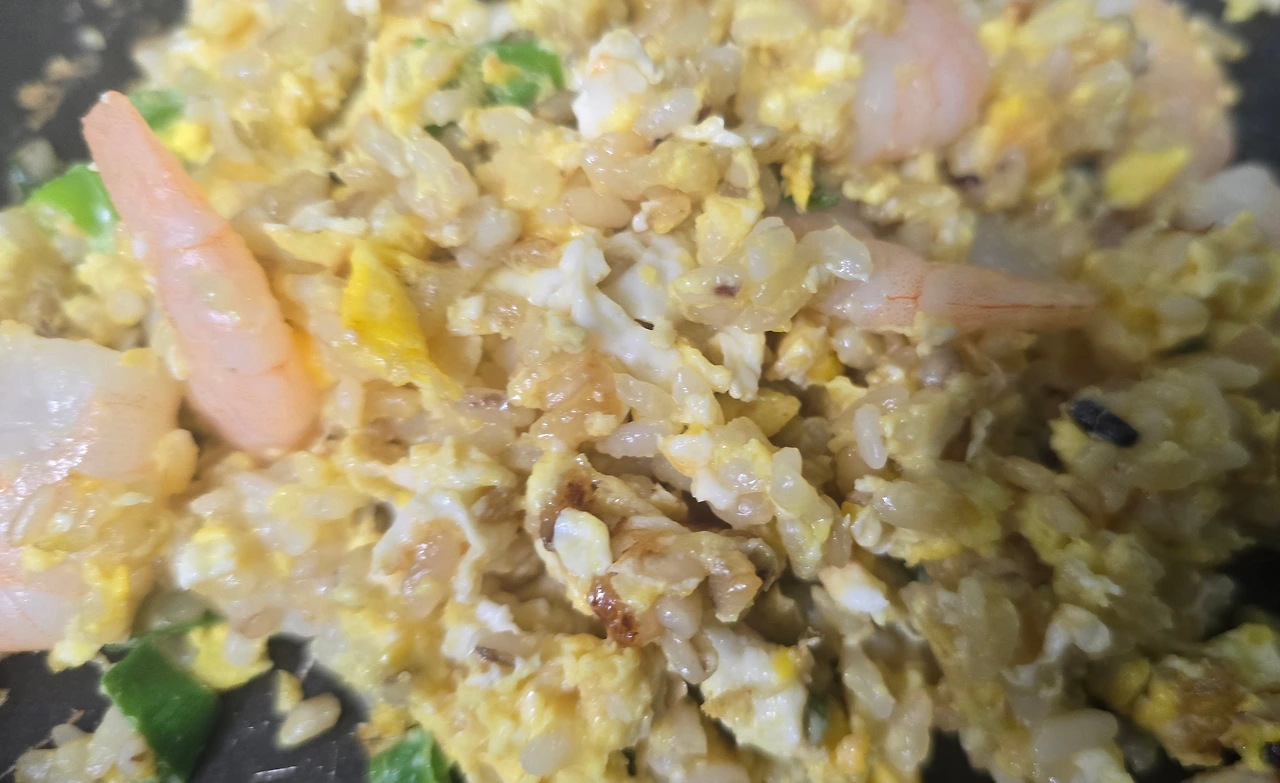 달궈진 팬에 냉동새우를 넣고 달걀을 풀고 파를 송송 썰어넣고 소금 한꼬집 간장 약간과 참기름 등뿍 넣고 고슬고슬하게 볶아낸다.