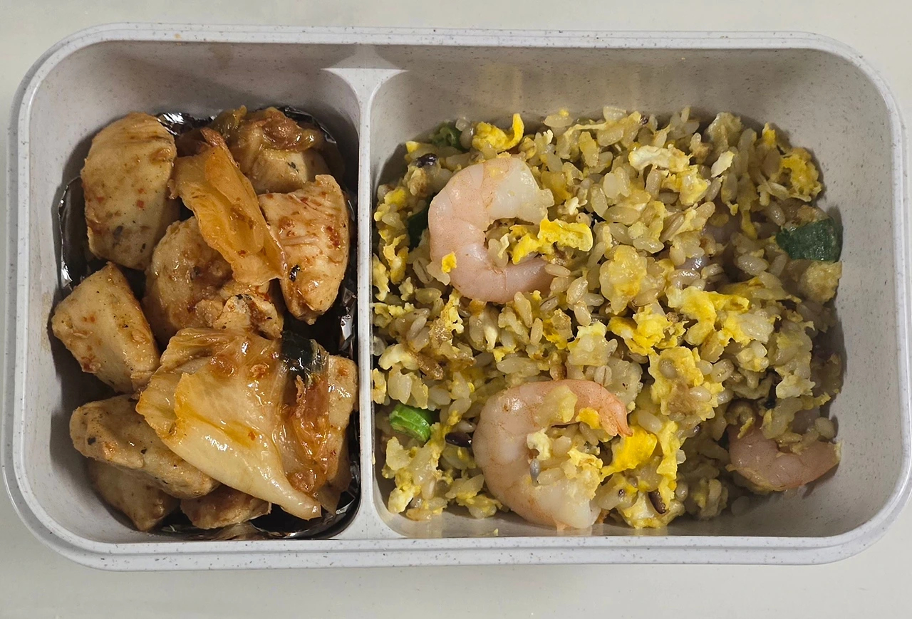 새우볶음밥과 닭가슴살 묶은지볶음.