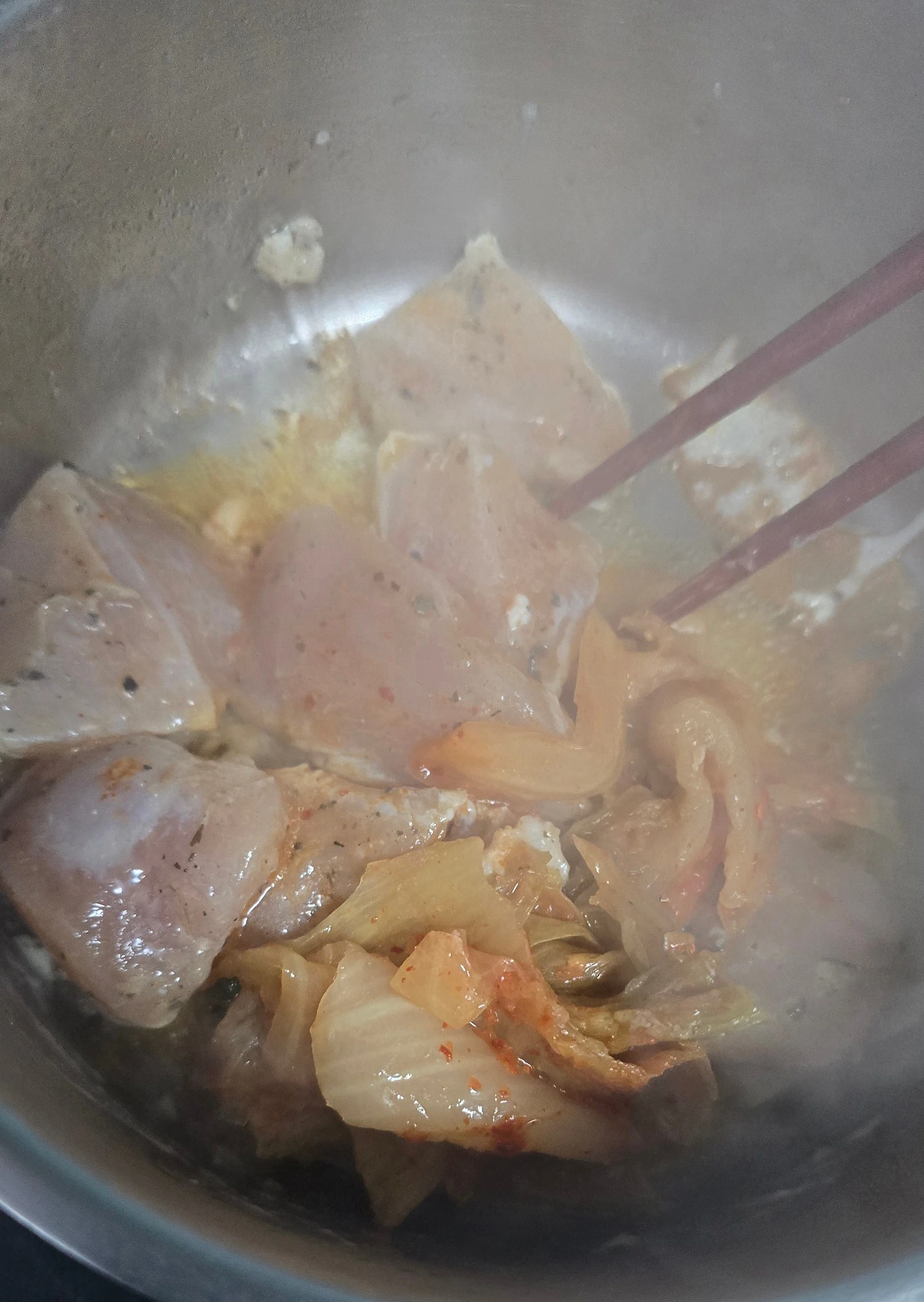 하브가 첨가된 닭가슴살 큐브를 팬에 넣고 묶은지를 넣고 들기름뿌려 볶아내 김치의 시큼한맛과 허브향이 헷갈리게 볶아친다.