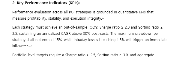 내 포지션은 Lead, Researcher, Trader의 성격이 동시에 요구된다. 단순히 전략을 리드하는 역할을 넘어, 퀀트팀에서 리서치/트레이딩하는 모든 전략 전반을 총괄하고 KPI에 부합하는 성과를 만들어내야 한다. 그것도 시장의 방향성과 무관하게, 항상 절대 수익을 내야 한다는 전제 하에.