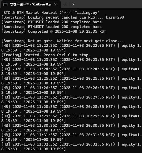 브런치 글을 쓰고 있는 지금 이 순간에도, 우리 회사의 전략은 실시간으로 시장에 연결되어 있다. 콘솔에는 equity 수치가 분 단위로 갱신되고, 새로운 캔들이 닫힐 때마다 신호가 재계산된다.
