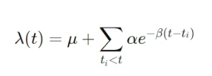 이 현상을 설명하는 대표적 모형이 Hawkes Process다. Hawkes 모델에서 체결 강도는 다음과 같이 표현된다.