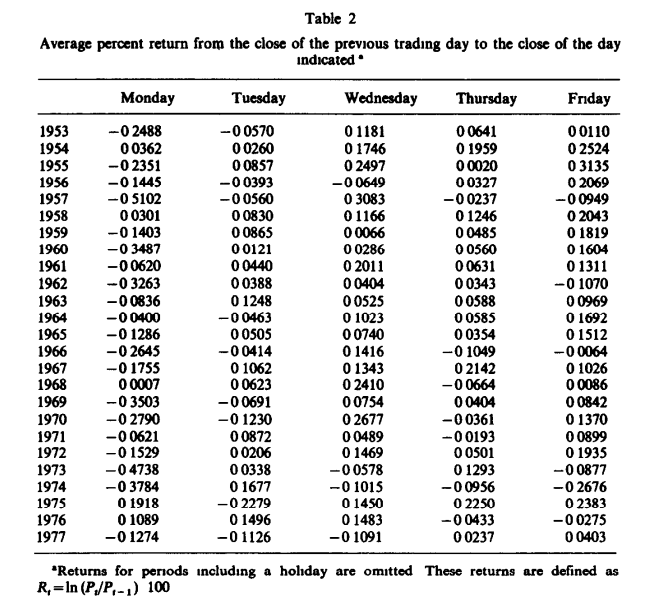 French, K. R. (1980), "Stock returns and the weekend effect," Journal of Financial Economics, 8(1), 55-69.