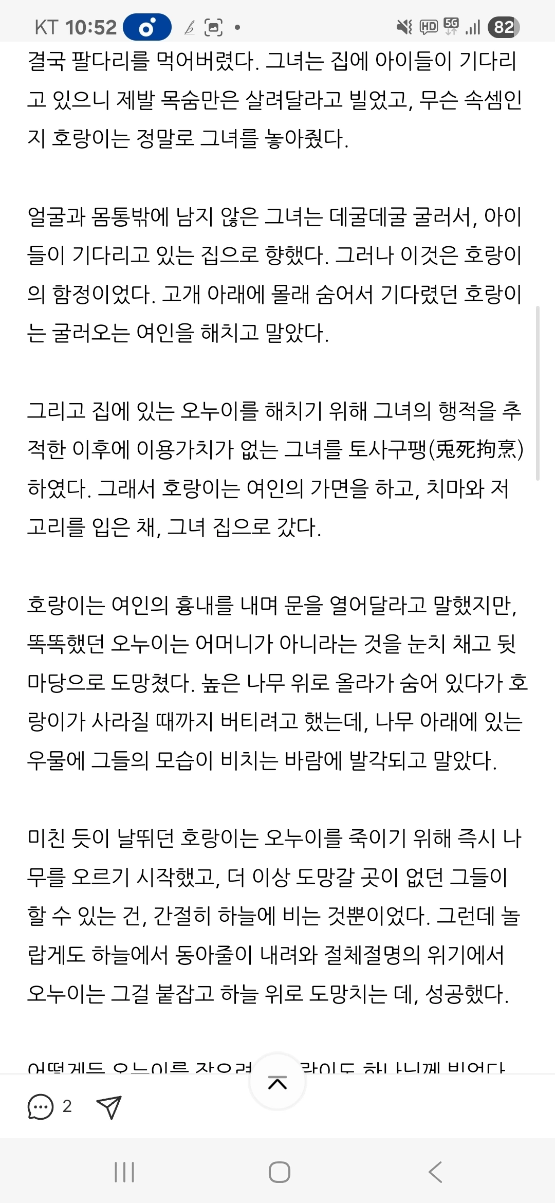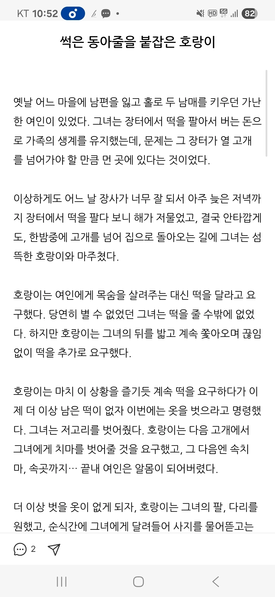 썩은 동아줄을 붙잡은 호랑이 옛날 어느 마을에 남편을 잃고 홀로 두 남매를 키우던 가난한 여인이 있었다....