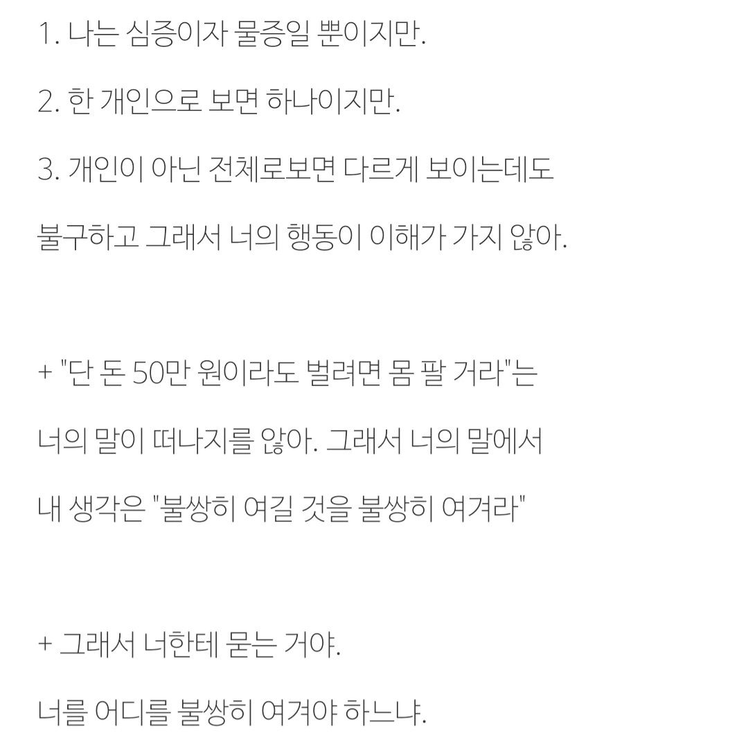 3. "단 돈 50만 원이라도 벌려면 몸 팔 거"라고.
