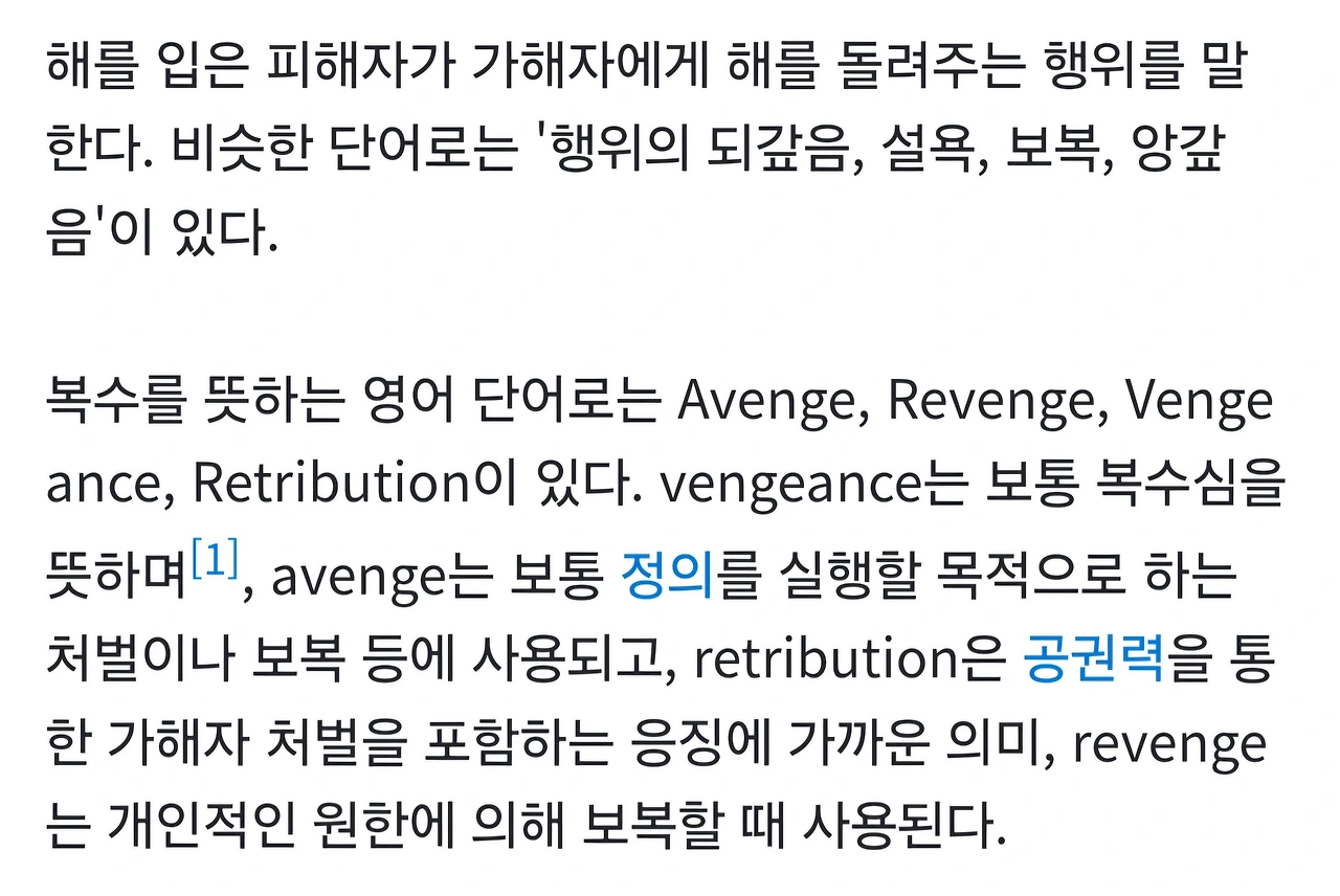 복수 : 해를 입은 피해자가 가해자에게 해를 돌려