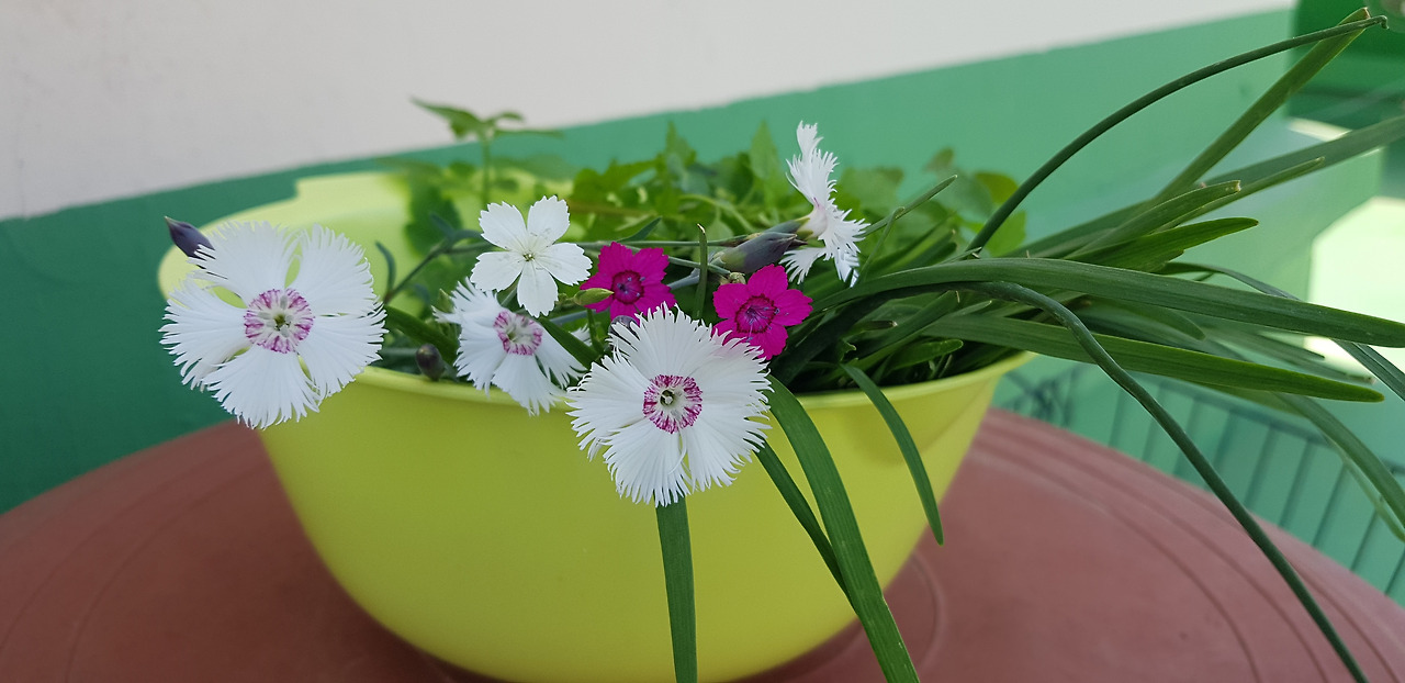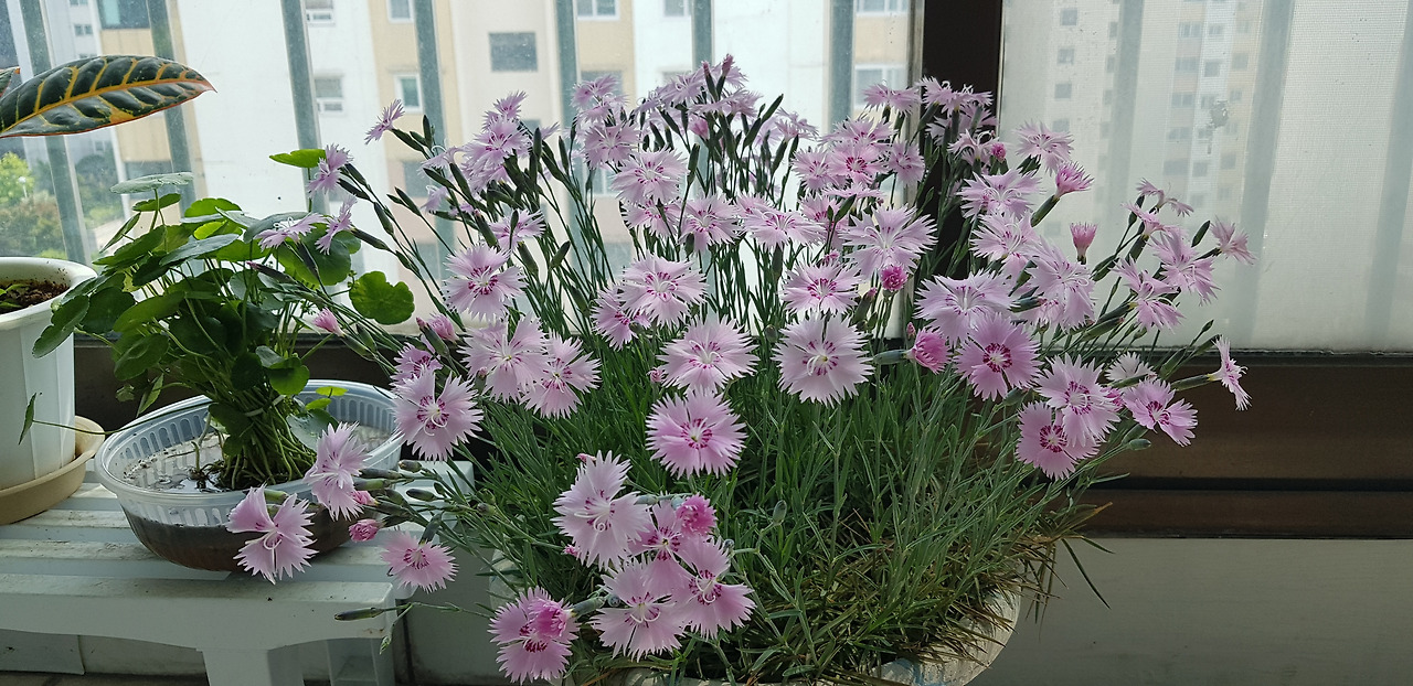 오늘은 옥상에서 자란 채소를 수확하면서 패랭이꽃도 몇 송이를 꺾어와 빈 병에 꽂아 놓았다. 이 패랭이는 흰색 바탕에 은은한 보랏빛이 도는 것과, 작은 크기에 진한 분홍빛이 어여쁜 것들인데, 수년 전 가평에 있는 <아침고요수목원>에 갔다가 씨를 받아다 심은 아이들이다. 커다란 화분에 있는 패랭이는 10년도 넘게 나와 함께 사는 ‘원조 패랭이’다. 지난겨울에 묵은 뿌리와 줄기를 다 솎아내고 분갈이를 해 주었더니 올해는 이렇게 꽃다발처럼 방사형으로 피었다.