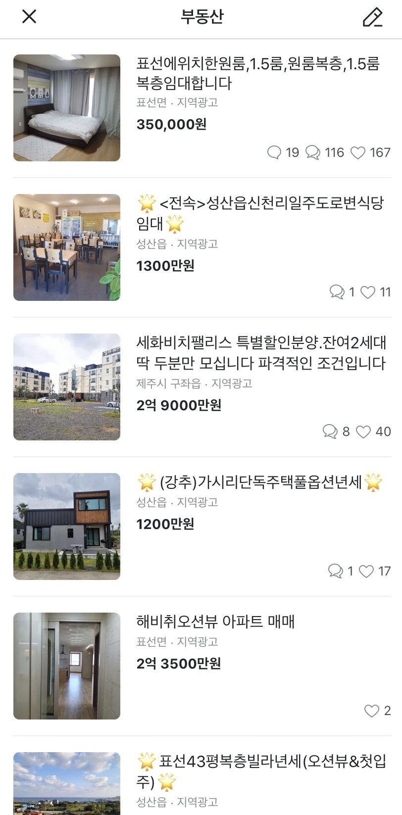 지역색이 강한 제주이다보니 아무래도 지역 베이스의 플랫폼인 당근마켓이 굉장히 활발합니다. 의외로 부동산 매물도 활발히 올라오는 편입니다.