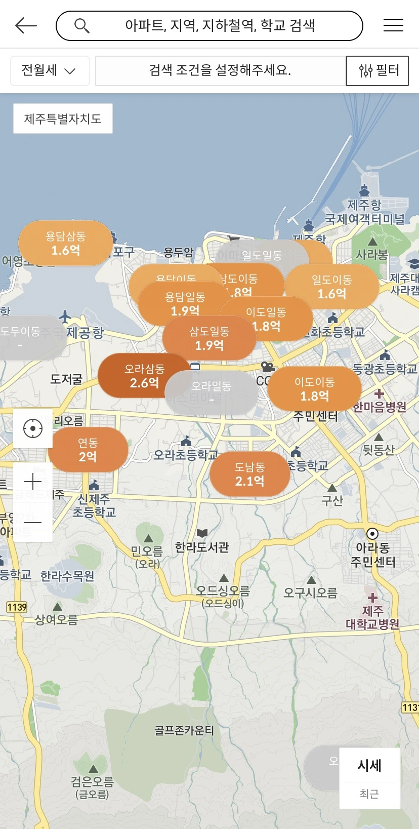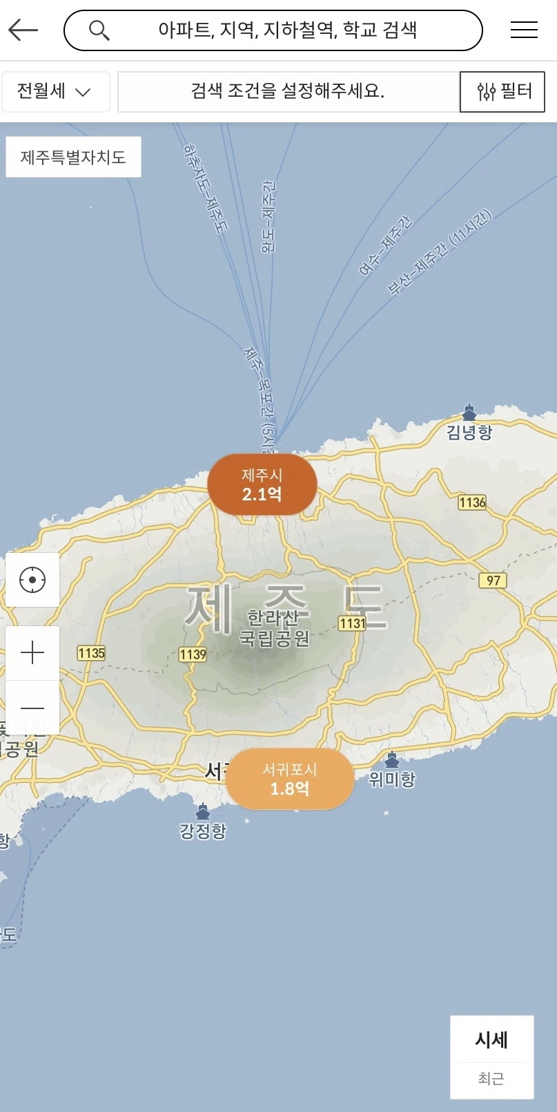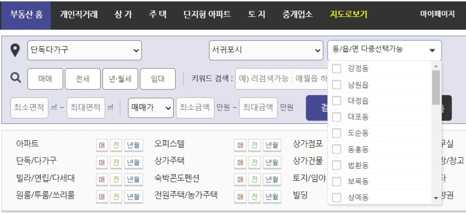 단, 단독주택 정보는 거의 찾기 어렵고 아파트나 원룸/투룸/쓰리룸 위주의 매물로 있습니다. 그렇다 보니 발전된 도시쪽 제주시내와 서귀포시내쪽으로 매물이 몰려있어요.