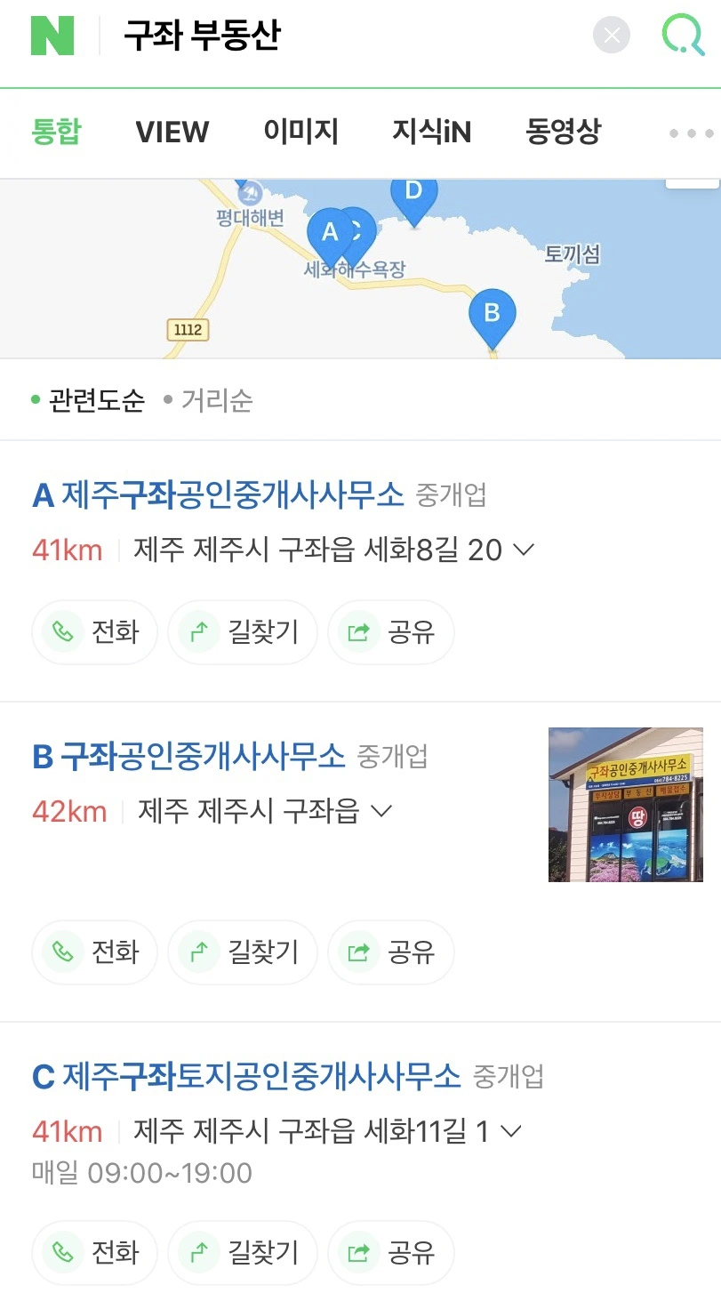 이건 제가 무작정했던 방법이에요. 부동산이 워낙 많다 보니 어디에 연락해야 할지 몰라, 제가 살고 싶은 동네의 부동산을 검색했어요. 예를 들어 구좌읍에 살고 싶다면, #구좌부동산 키워드로 검색하면 부동산 정보가 쫙 나오죠.