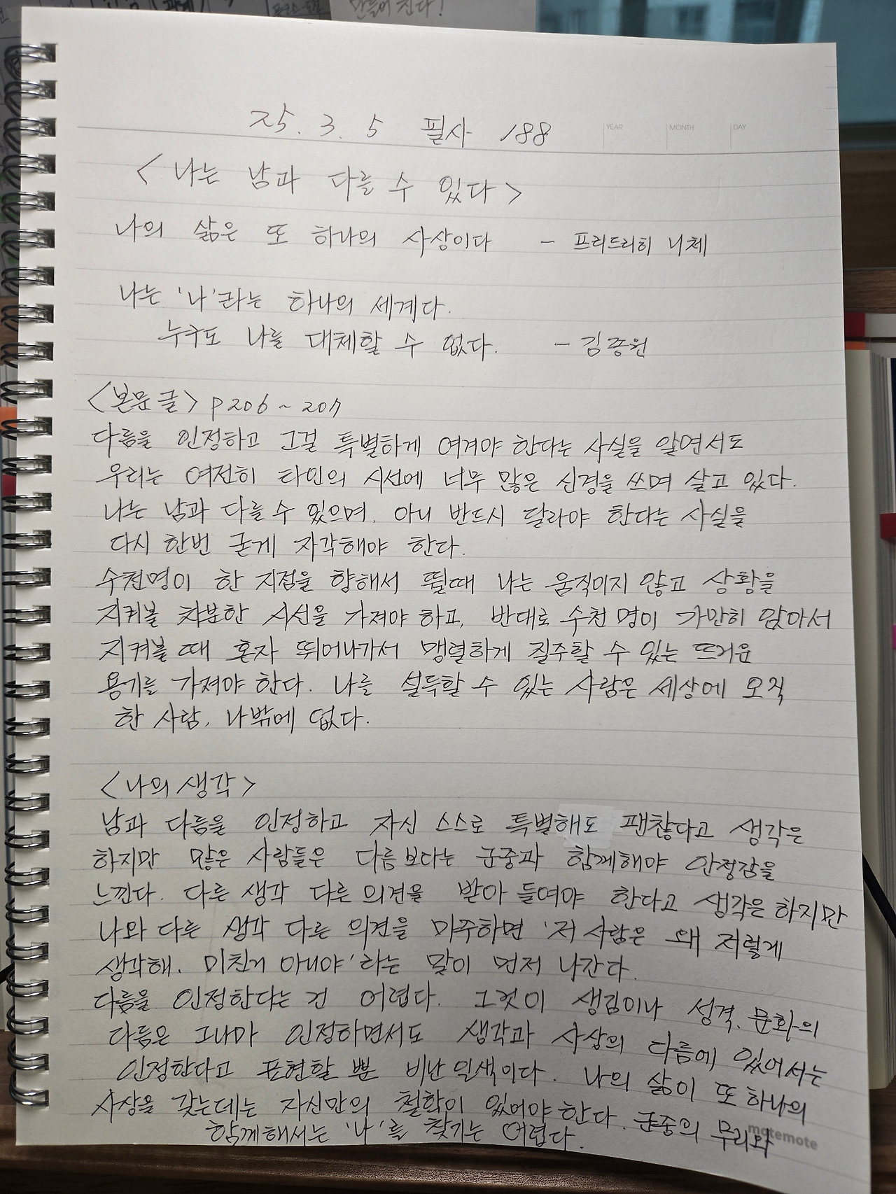나는 남과 다를 수 있으며 아니 반드시 달라야 한다는 사실을 다시 한번 굳게 자각해야 한다.