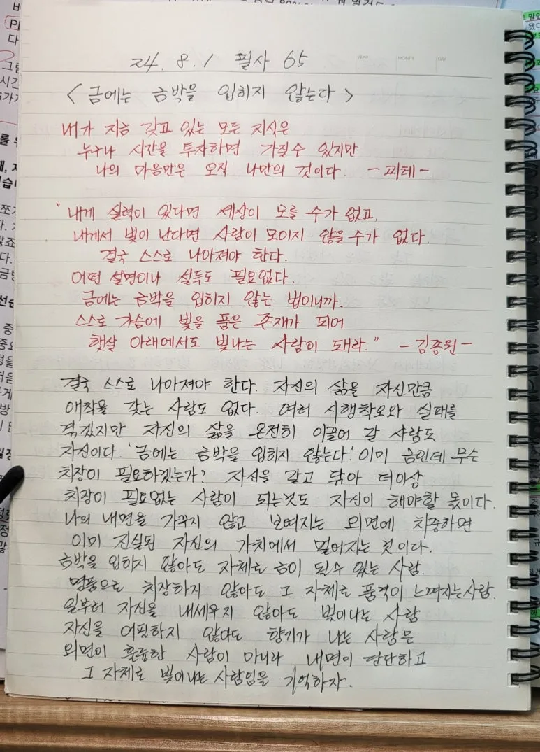 "내게 실력이 있다면 세상이 모를 수가 없고, 내게서 빛이 난다면 사람이 모이지 않을 수가 없다. 결국 스스로 나아져야 한다. 어떤 설명이나 설득도 필요 없다. 금에는 금박을 입히지 않는 법이니까. 스스로 가슴에 빛을 품은 존재가 되어 햇살 아래에서도 빛나는 사람이 돼라." - 김 종원 -