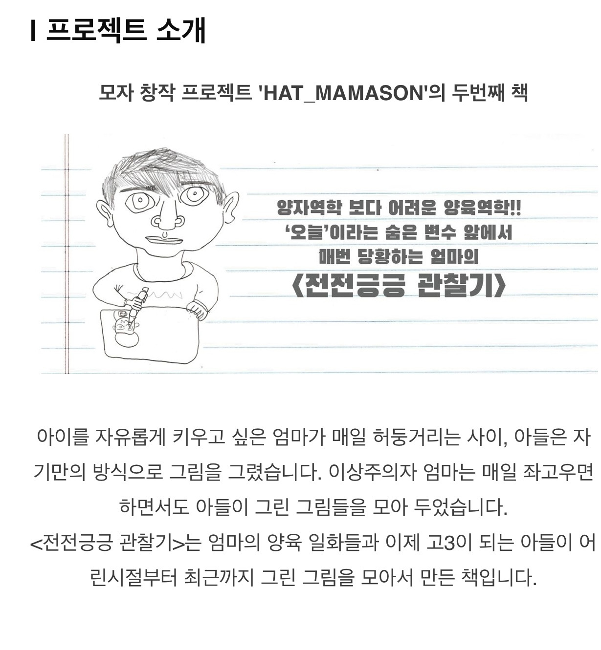 <전전긍긍 관찰기>는 엄마의 양육 일화들과 이제 고3이 되는 아들이 어린시절부터 최근까지 그린 그림을 모아서 만든 책입니다.