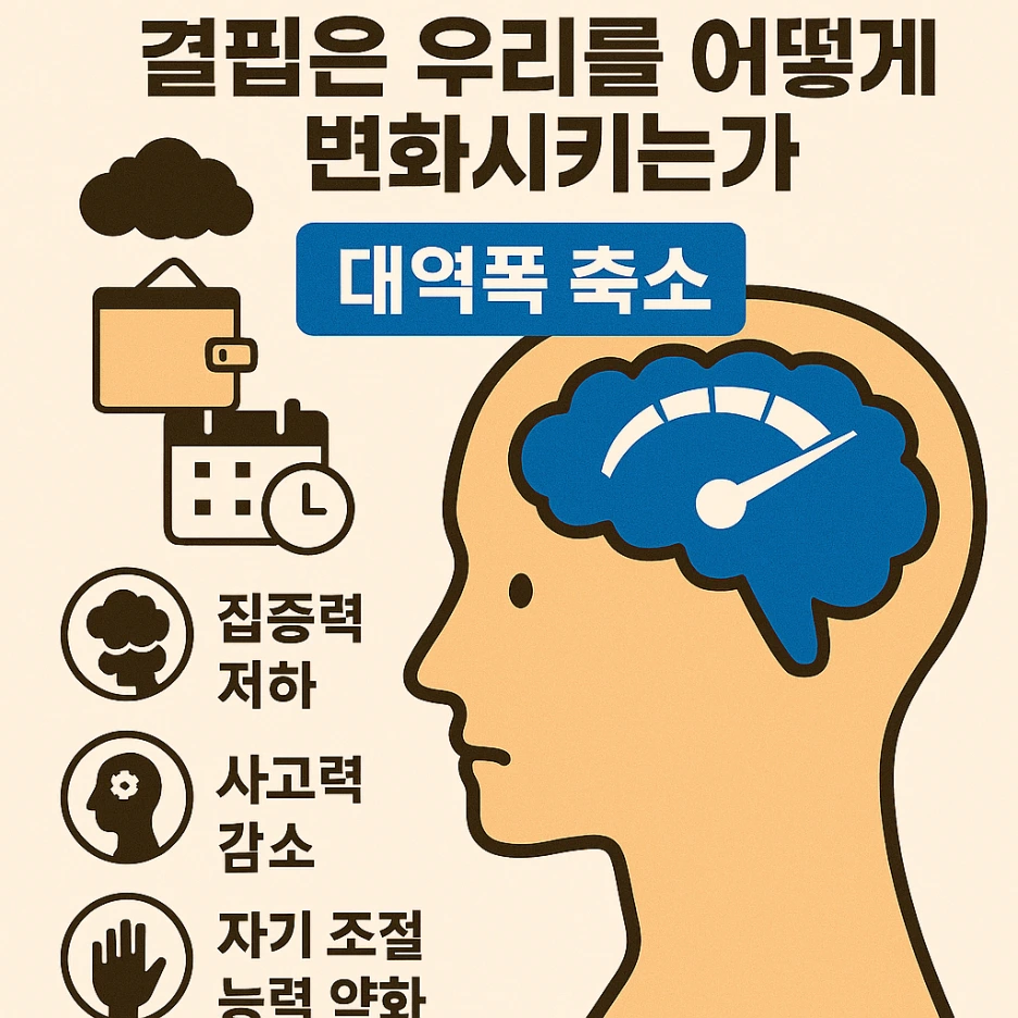 결핍은 갚지도 못할 정도로 많은 돈을 빌리게 만들거나 필요한 투자를 하지 못하게 만드는 데 그치지 않는다. 결핍은 삶의 다른 측면에서 우리에게 불리한 조건을 덧씌운다. 결핍은 우리를 멍청이로 만든다. 우리를 보다 더 충동적으로 만든다. 우리는 훨씬 더 낮은 정신능력과 보다 낮은 유동성 지능, 그리고 더욱 위축된 실행 제어 능력을 가지고 살아가야만 한다. 124