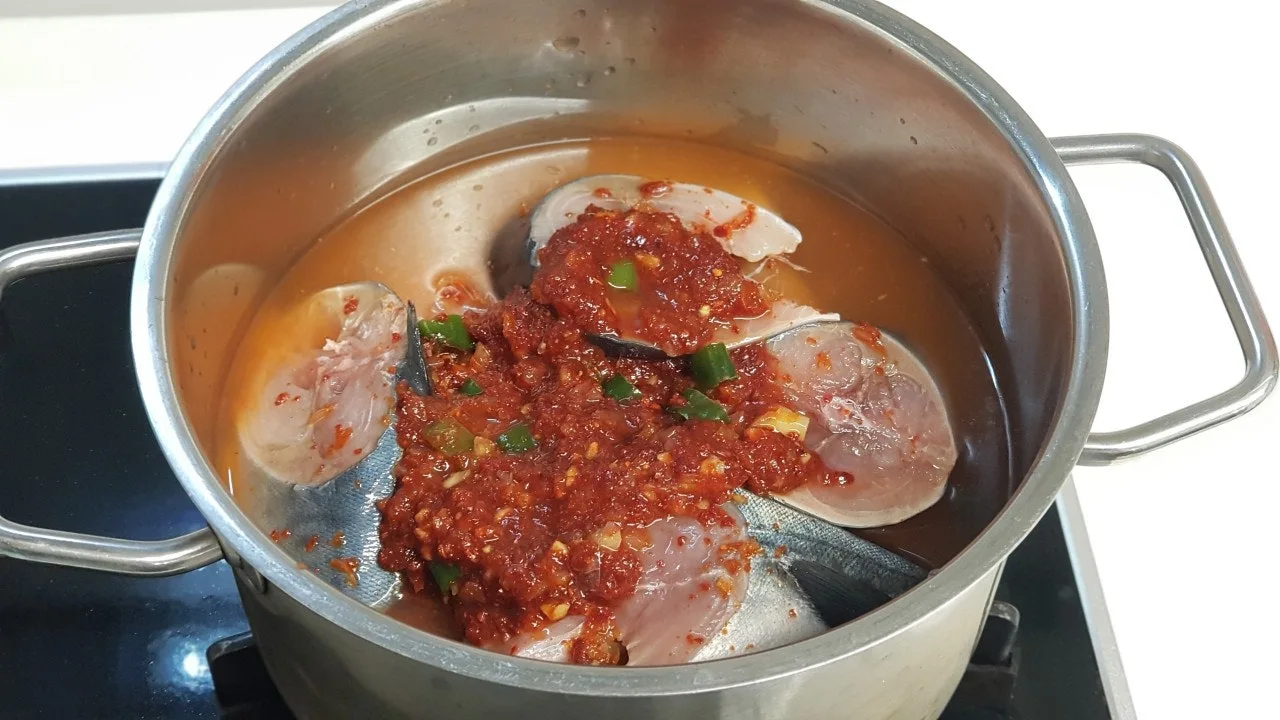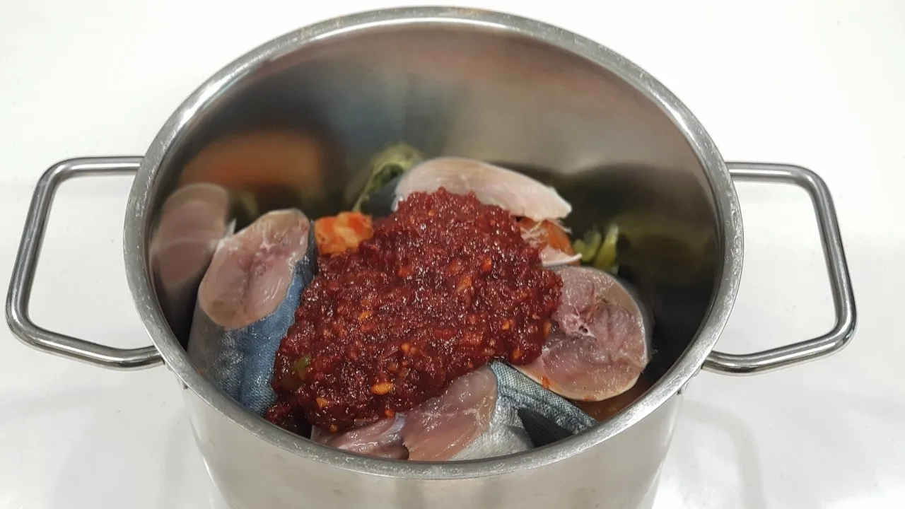 이때, 국자나 숟가락으로 양념을 푼 국물을 고등어 덩어리 위로 끼얹어 주세요.