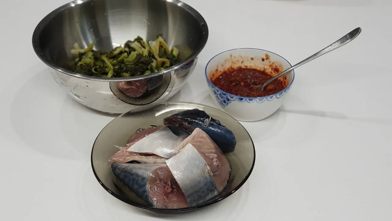 무청 시래기는 칼로 먹기 좋게 썰고, 고등어와 양념을 준비합니다.