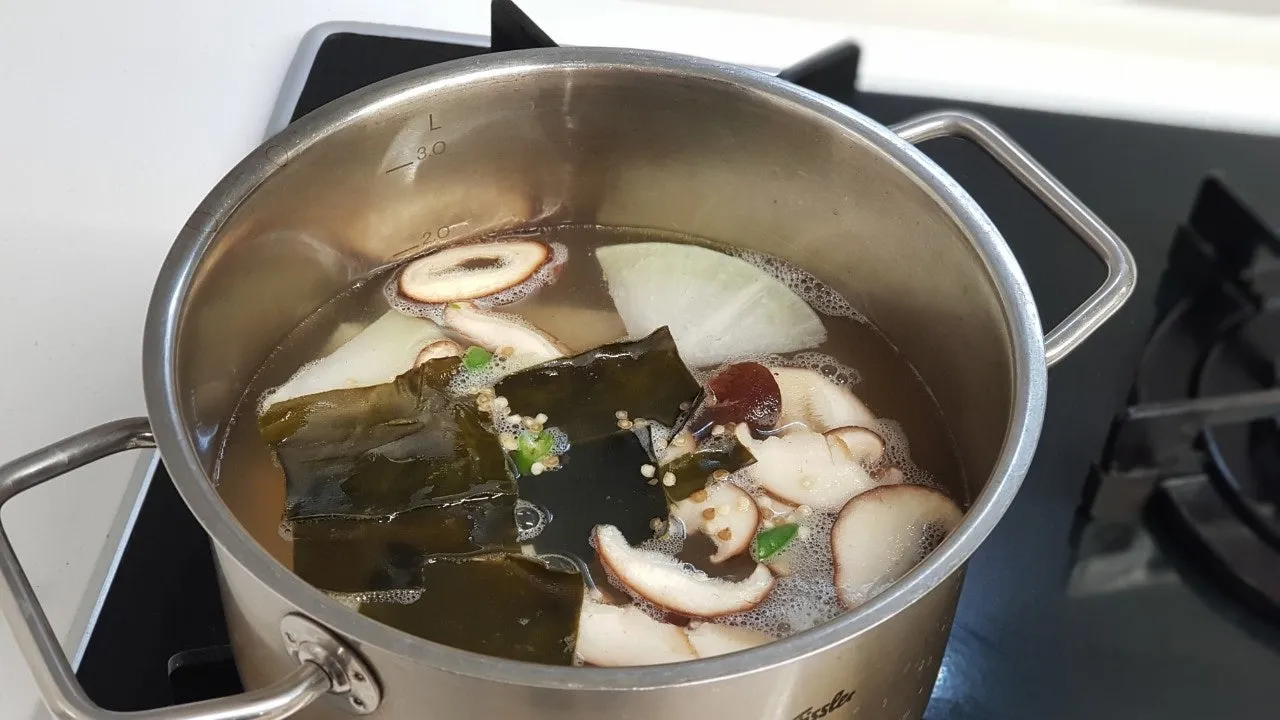 멸치에 무, 다시마, 표고버섯, 땡초로 육수 푸욱~ 우려서