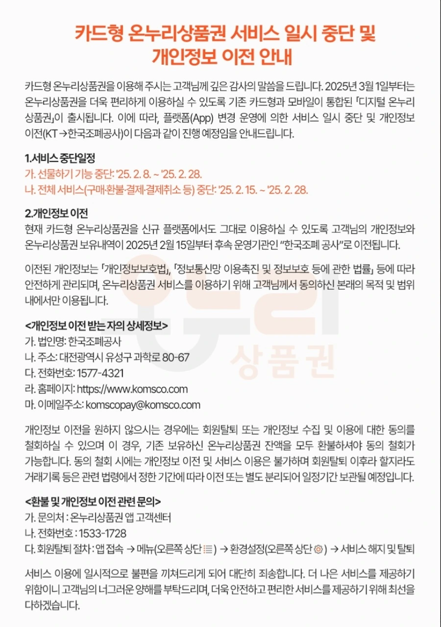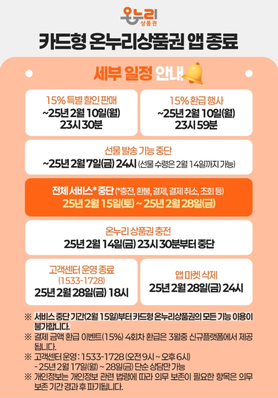 온누리 상품권 앱을 검색해 보니 온라인 카드형, 충전형 상품권의 종료 시기가 안내되어 있었다.