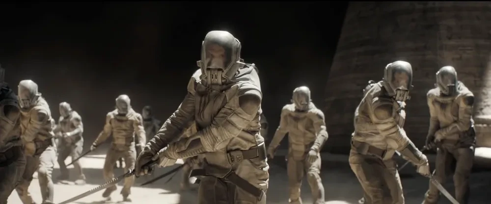 샤이 훌루드를 타고 등장하는 프레멘의 기습, 도망치는 자들은 사다우카와 하코넨 가문의 병사들(출처-다음 맥스무비 '티모시 살린 역대급 사막, 이렇게 탄생했다)
