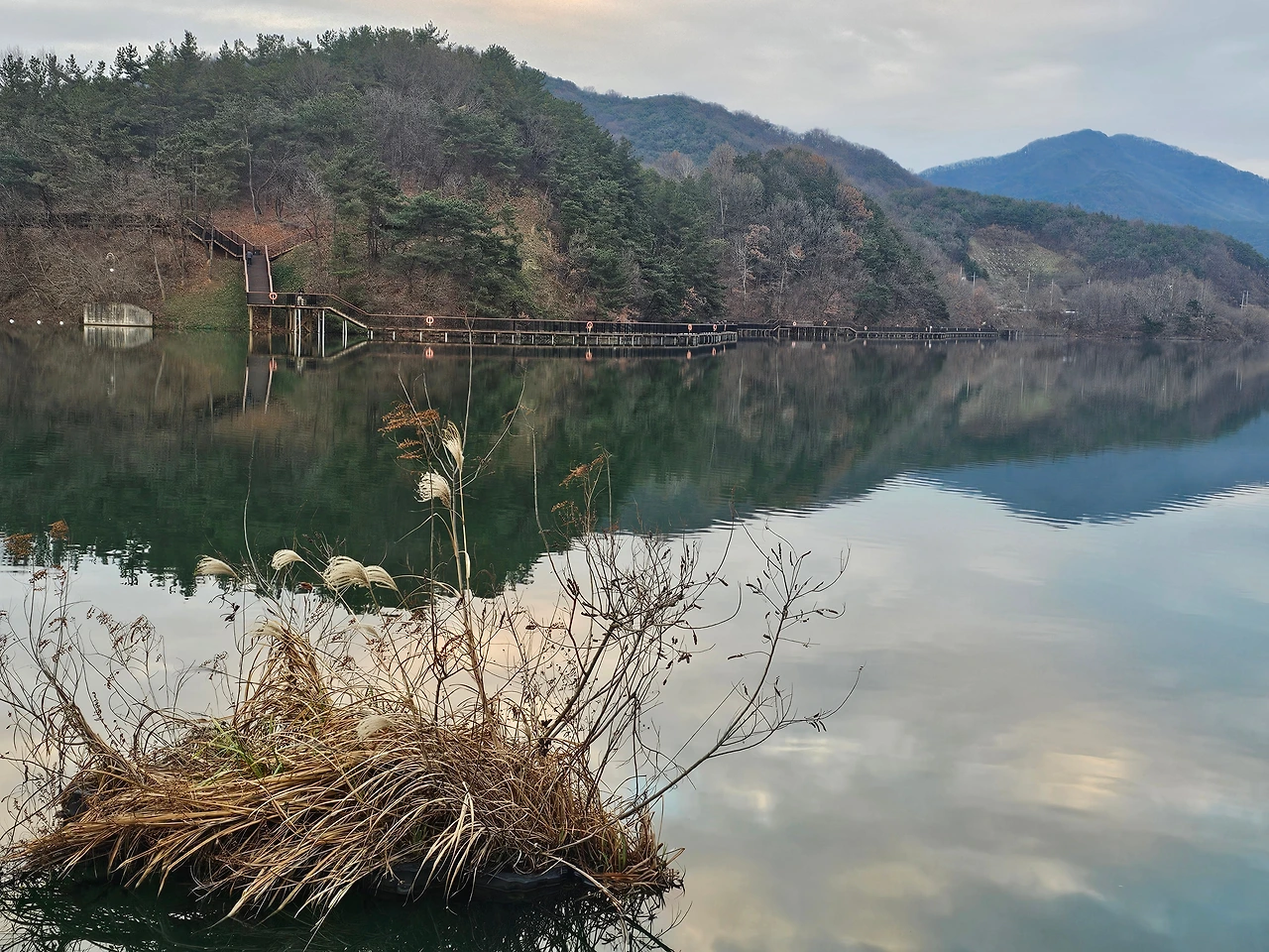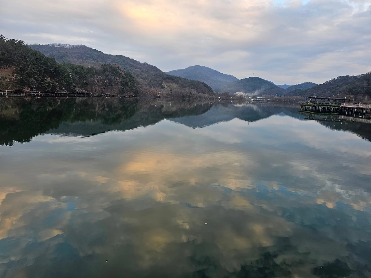 해거름 녘에 저수지에 비친 하늘이