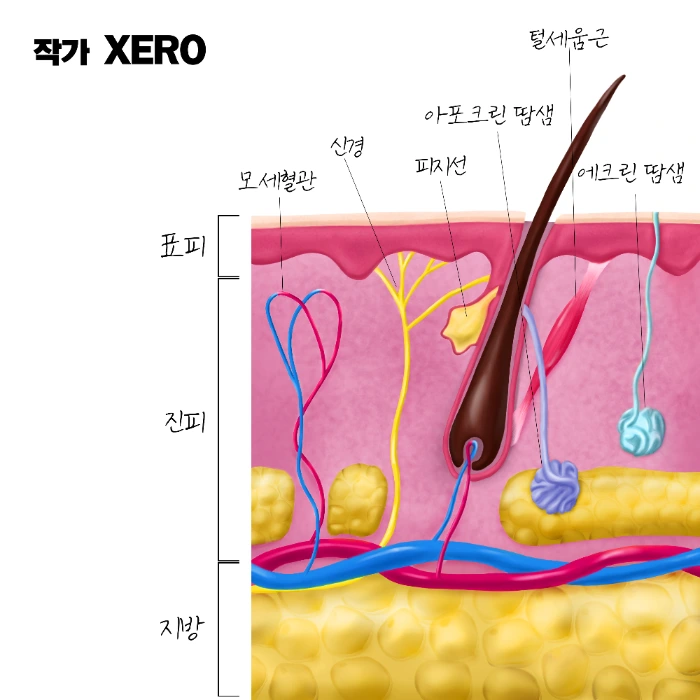땀을 발생시키는 땀샘은 두 가지로 나뉜다. 표피로 직접 연결된 에크린 땀샘은 무기물이 포함된 냄새가 없는 물을 분비하는데, 주로 체온 조절을 위해 작동되는 땀샘이다. 하지만 아포크린 땀샘에서 분비되는 물은 지방산과 암모니아가 포함될 수 있어 악취가 난다는 특징이 있다. 그림에서 보이듯이 아포크린 땀샘은 모낭과 연결되기 때문에 털구멍에서 나오는 땀이다.