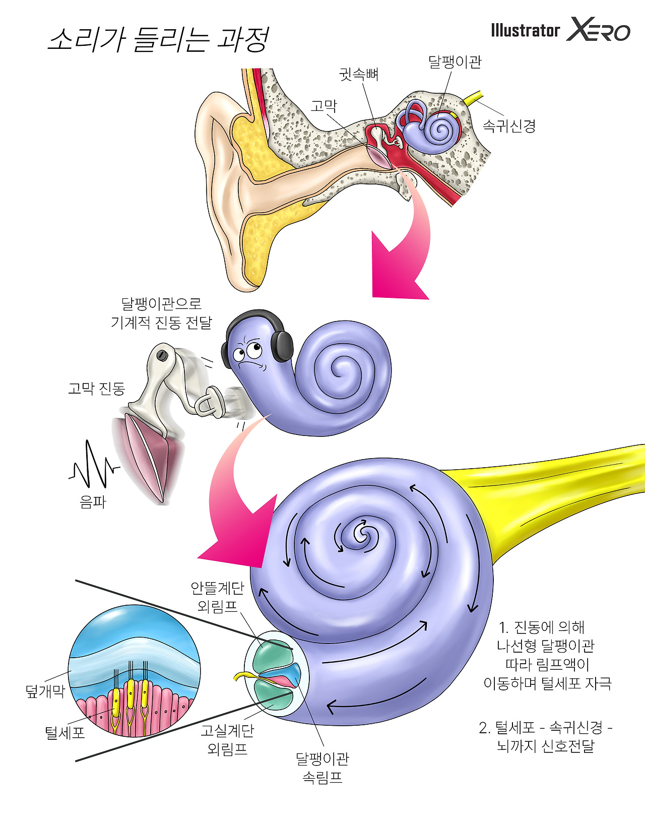 소리가 귀를 통해 뇌까지 전달되는 과정은 꽤나 복잡한 과정을 통해 이루어진다. 먼저 공기에 의해 전달된 소리는 고막을 진동시킨다. 고막은 매우 탄력적이고 얇은 막으로, 뒤에는 귓속뼈라는 작은 뼈가 연결되어 있다. 고막이 진동함에 따라 귓속뼈는 같이 진동하게 되며 옆에 있는 달팽이관을 때리게 된다. 이 과정에서 소리는 공기에서 기계적 에너지로 전환되고 최대 26배까지 소리 크기가 증폭된다.
