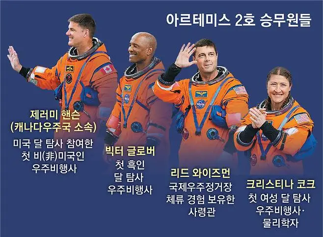 아르테미스 2호에는 네 사람이 타고 있다. 사령관 리드 와이즈먼, 조종사 빅터 글로버, 임무 전문가 크리스티나 코크, 그리고 캐나다 우주비행사 제러미 핸슨. 글로버는 달 탐사에 나서는 최초의 흑인 우주비행사다. 코크는 달 궤도에 진입하는 최초의 여성이다. 핸슨은 지구 저궤도를 넘어가는 최초의 캐나다인이다.