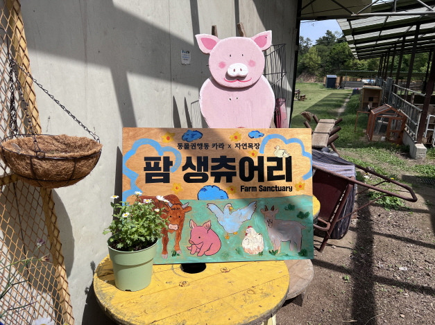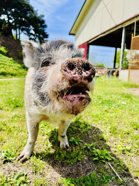 하지만 50여 마리의 행복한 토종돼지를 키우던 자연목장은 2023년 큰 변화를 겪게 됩니다. 아프리카 돼지열병(ASF)으로 모든 양돈농장은 가축전염병 확산을 막기 위해 8대 방역 시설 설치 의무화가 입법화되면서 자연목장의 사육방식으로는 더 이상의 축산이 불가능해졌기 때문입니다. 어떠한 가축전염병도 발생하지 않았지만, 정부 방침을 거스를 수 없었기 때문에 지난해부터 자연목장은 새롭게 팜 생츄어리(Sanctuary) 농장으로 변화하였습니다. 위급하거나 고통스러운 환경에 놓여 있던 동물이나 야생으로 돌아가기 힘든 상황의 동물을 보호하기 위해 활동하고 있습니다. 개목장에서 사육되던 미니 피그, 염소 등이 새로운 가족이 되었습니다.